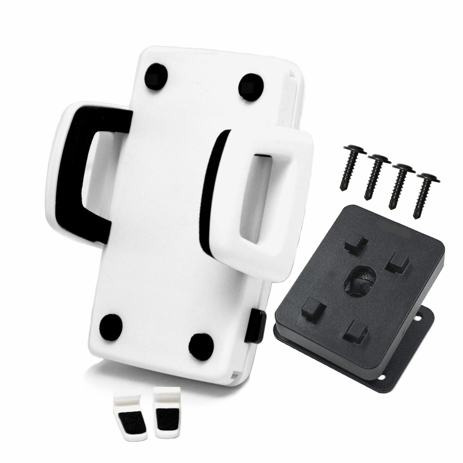 Lieferumfang | Weisse verstellbare Halteschale Schwarze Sockelbefestigung mit Schrauben |