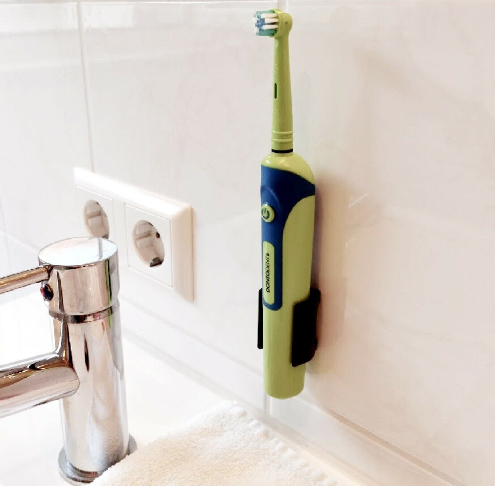 Stylische; schwarze (damit gut sichtbare Halterung beim zielen) Halterung zum ankleben für elektrische Zahnbürsten. Das Material ABS Kunststoff stammt aus dem Autozubehör und ist dadurch unempfindlicher gegen Hitze; Kälte und Feuchtigkeit. Wenn Sie die nachfolgende Anleitung beachten, wird Ihnen die Halterung dauerhaft Freude bereiten. Das mitgelieferte Moosgummi-Klebepad (aufgeklebt oder zum ausschneiden beigefügt) bitte auf sauberen, fettfreiem Untergrund 24 Stunden ohne Gewicht einwirken lassen. "Jedem seine Halterung an anderer Stelle" liegt klar auf der Hand; die abgebildete Zahnbürste wird nicht mitgeliefert. Prüfen Sie bitte die Abmessungen vor dem Kauf.