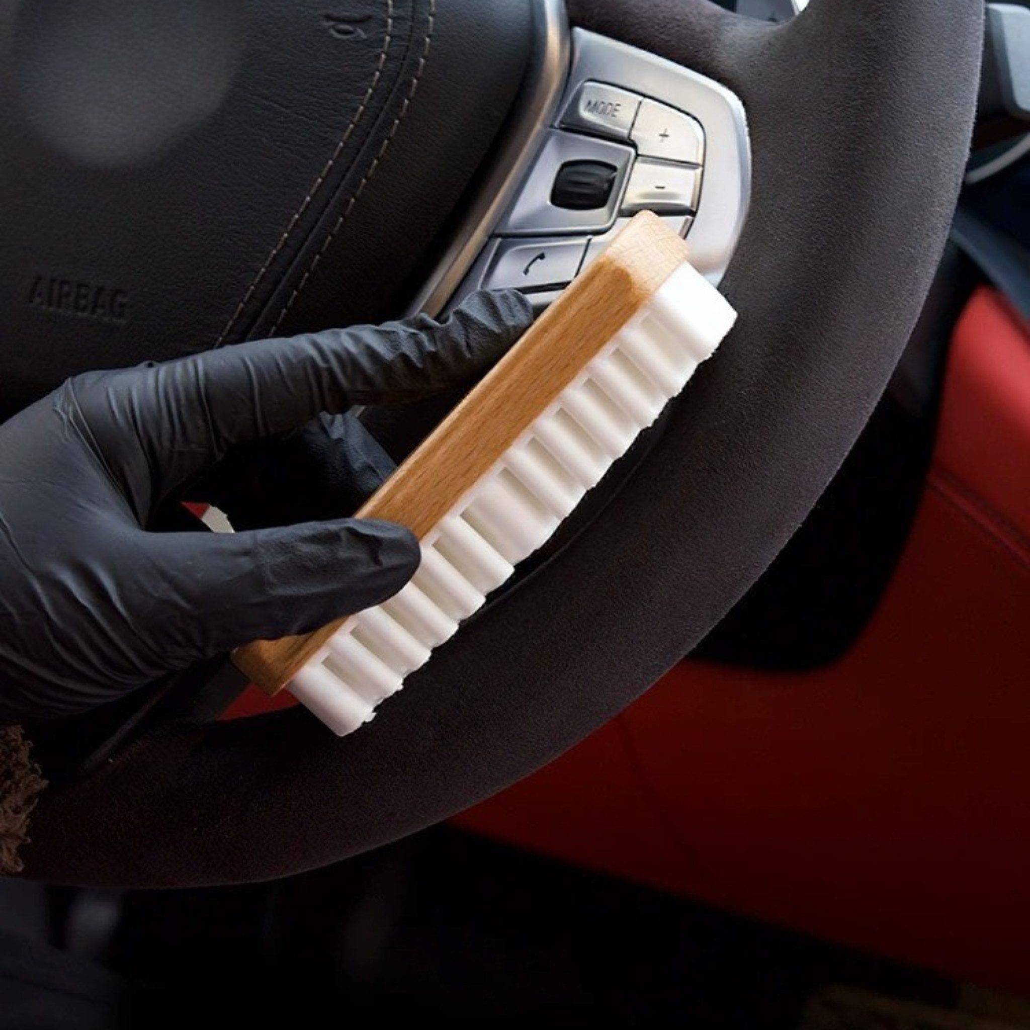 Die hochwertige Reinigungsbürste für Autoinnenräume entfernt schonend aber effektiv Schmutz, Staub und Ablagerungen von empfindlichen Materialien wie Wildleder, Alcantara und Nubuk. Mit einem ergonomischen Griff aus Buchenholz und einem Reinigungskopf aus 100 % natürlichem Krepp ist sie die perfekte Lösung für die Pflege sensibler Fahrzeugoberflächen.