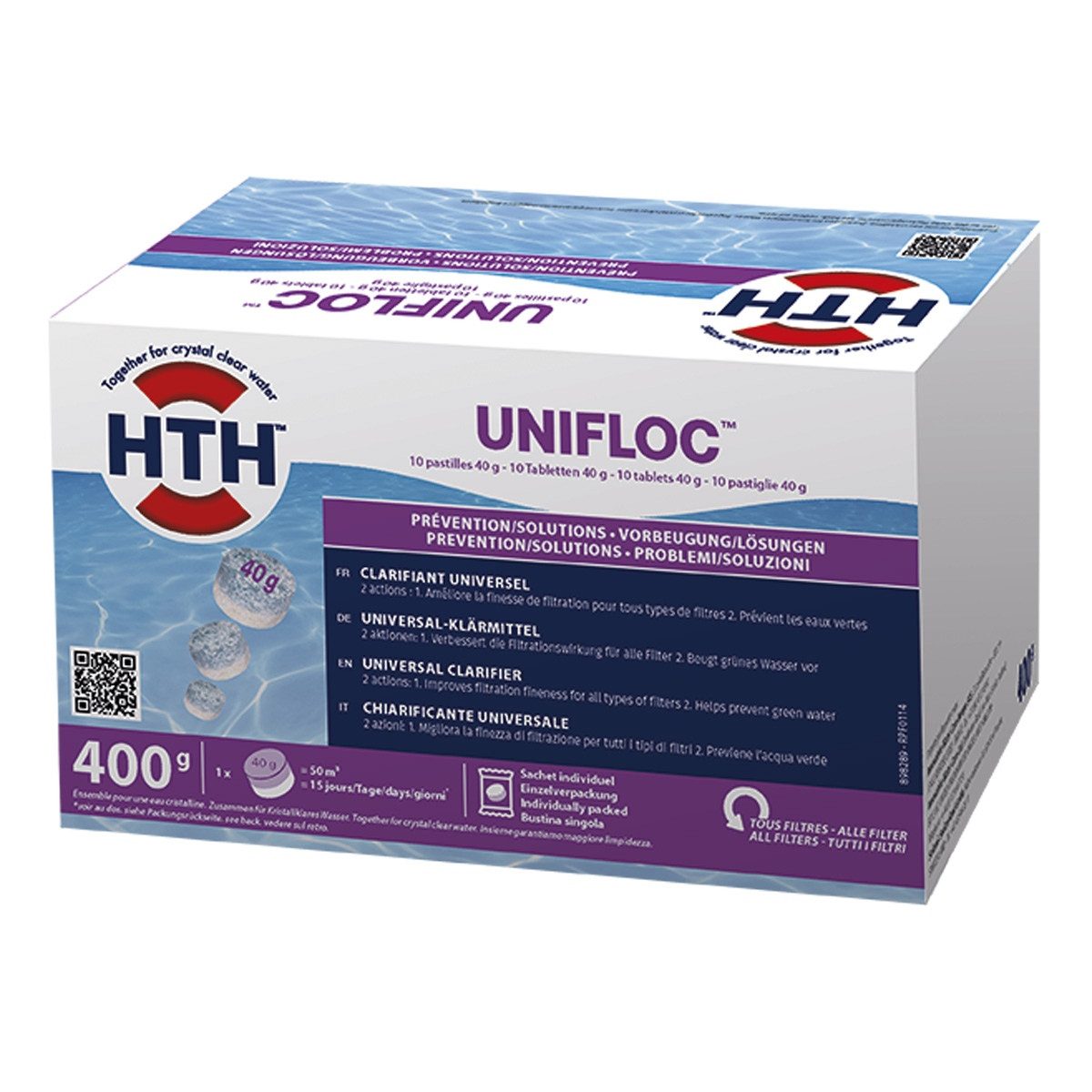 HTH UNIFLOC als Flockungsmittel-Tabletten geben den Flockungswirkstoff kontinuierlich ab und sind je nach Trübung bis zu 15 Tage wirksam.
