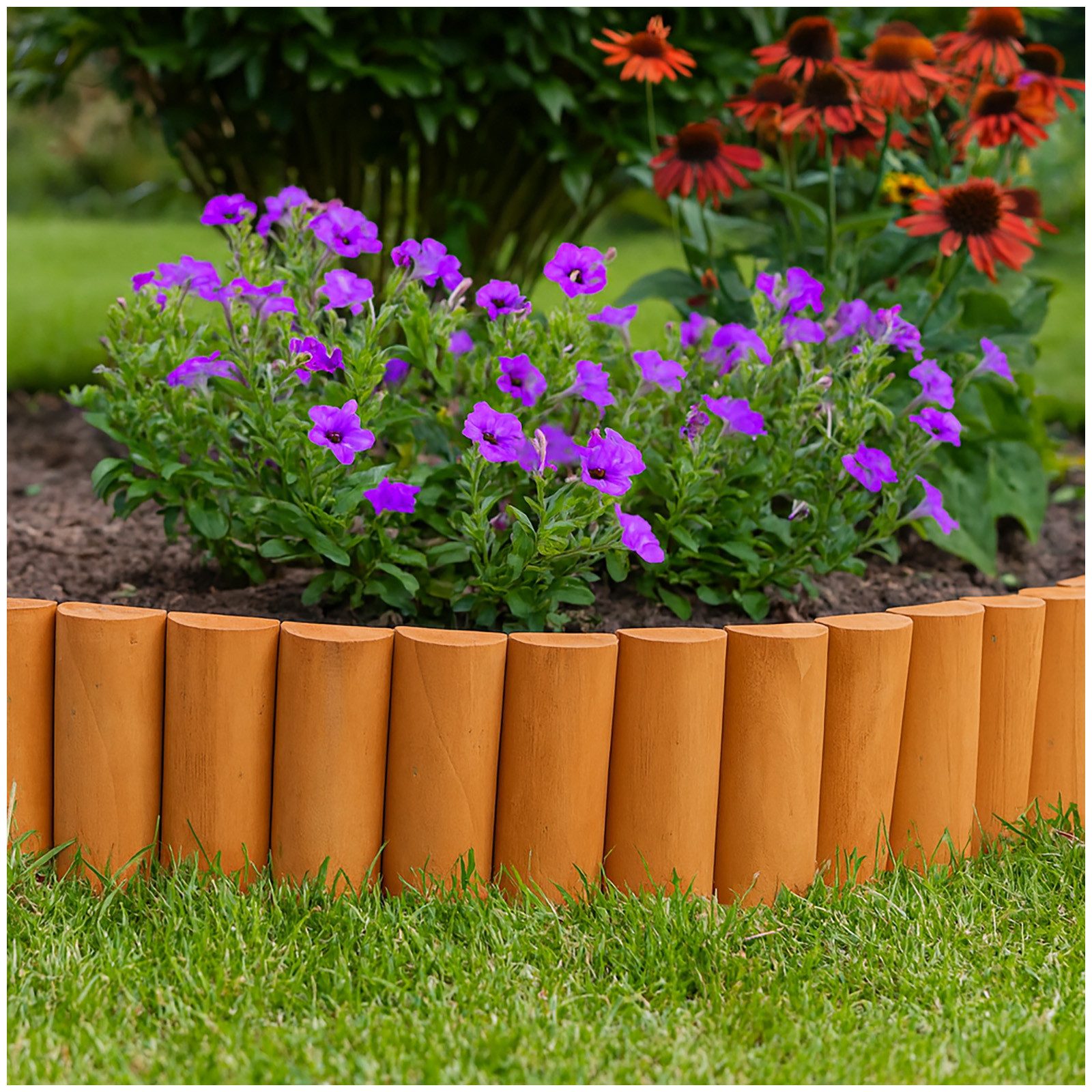 Mit dieser hochwertigen Beetumrandung aus halbrunden Holz-Elementen gestalten Sie Ihre Beete, Rasenflächen und Wege im Garten ordentlich und dekorativ. Die flexible Einfassung sorgt für eine natürliche Abgrenzung und lässt sich leicht anpassen. Die Beetkante besteht aus robustem, wetterbeständigem Holz und ist durch die stabile Drahtverbindung flexibel formbar. Perfekt für geschwungene Beete, Blumenrabatten oder als kleine Zaunabgrenzung.Da es sich um ein Naturprodukt handelt, empfehlen wir, das Holz regelmäßig mit einer geeigneten Holzlasur oder Imprägnierung zu behandeln, um es dauerhaft vor Witterungseinflüssen zu schützen.