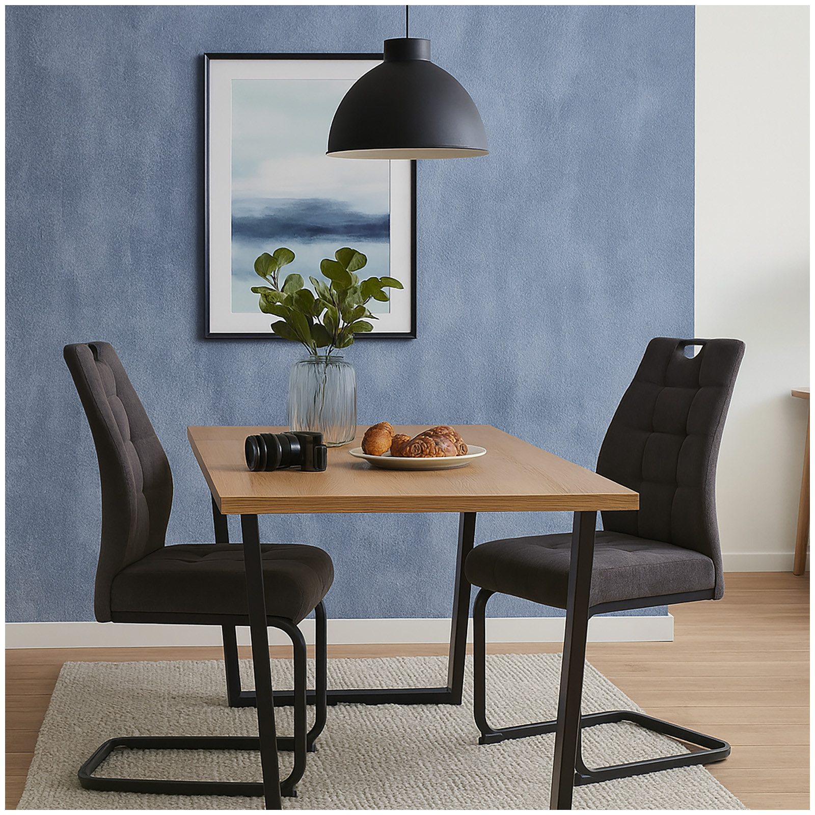 Das 2er Set Schwingstühle überzeugt mit modernem Design, hoher Stabilität und exzellentem Sitzkomfort. Der Bezug aus strapazierfähigem Polyester mit markanter Steppung verleiht den Stühlen einen stilvollen Look. Die komfortable Federkernpolsterung sorgt für angenehmes Sitzen, selbst über längere Zeit. Dank des Griffs an der Rückenlehne lassen sich die Stühle bequem bewegen. Das schwarze Kufengestell aus Metall bietet hohe Stabilität und ist bis 120 kg belastbar. Mit ihrer Sitzhöhe von 49 cm und einer Sitztiefe von 45,5 cm passen die Schwingstühle perfekt an jeden Esstisch und sind die ideale Wahl für Esszimmer, Küche oder moderne Wohnbereiche. Technische Daten: Maße: B/H/T 46 x 96 x 62 cm Sitzhöhe: 49 cm Sitztiefe: 45,5 cm Bezug: Polyester mit markanter Steppung Polsterung: Federkern Rückenlehne mit praktischem Griff Gestell: Schwarzes Metall-Kufengestell Belastbarkeit: bis 120 kg Lieferumfang: 2x Schwingstuhl mit Federkern und Polyester-Bezug