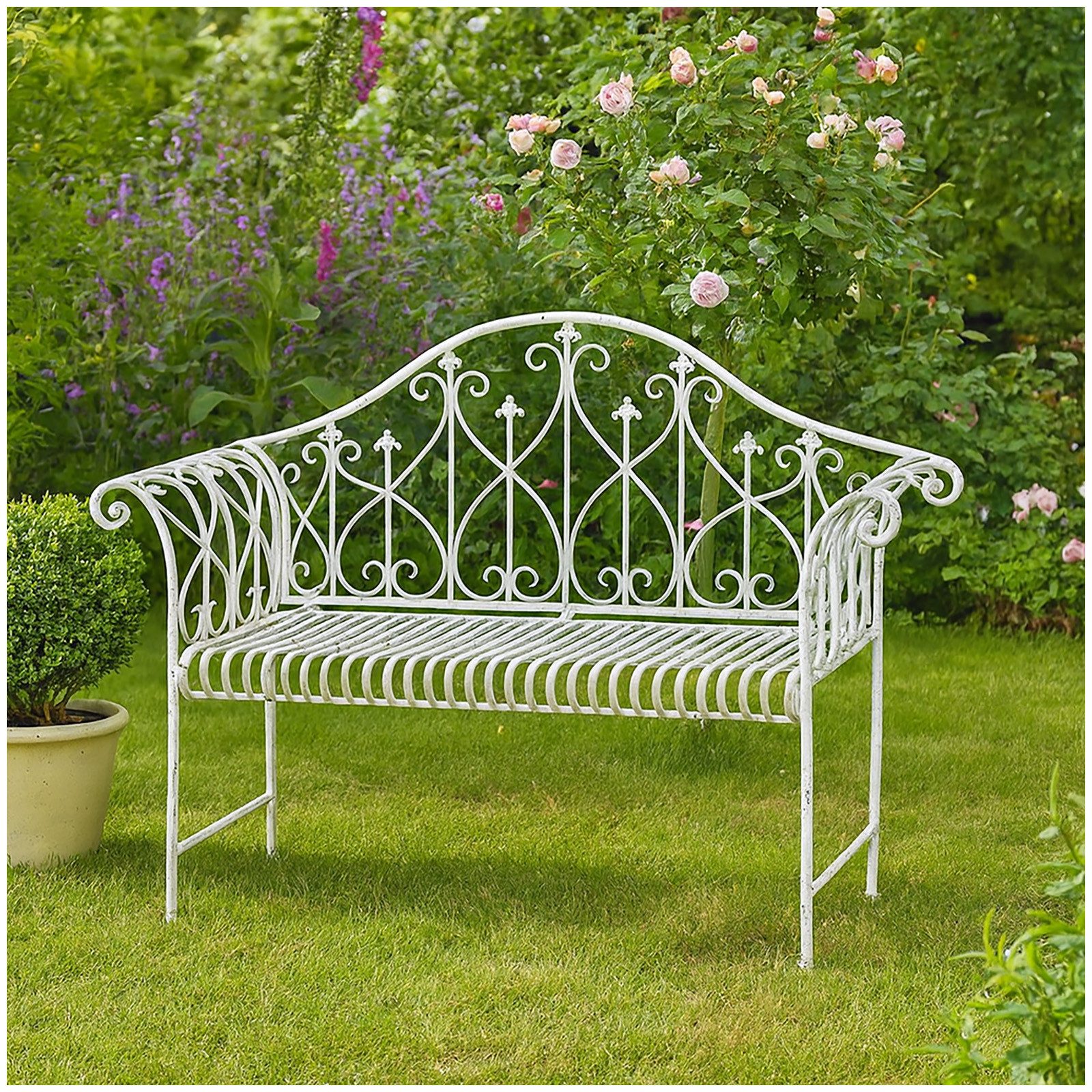 Romantische Gartenbank aus Metall in Weiß im nostalgischen Design