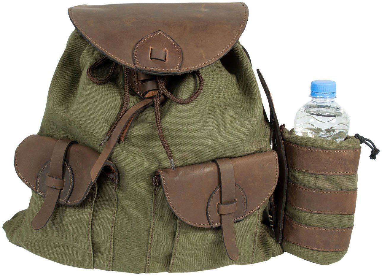 Ein traditioneller Jagd- & Wanderrucksack in hochwertigster Verarbeitung mit Patten, Bändern und Trägern aus Büffelleder. Durch die verwendeten Materialien ist ein nahezu geräuschloser Gebrauch möglich, was diesen Rucksack zum perfekten Begleiter mit vielen Verstaumöglichkeiten bei der Jagd macht. Der lautlose Hubertus® Rucksack aus imprägniertem Canvas verfügt über ergonomisch geformte, gepolsterte Trageriemen und Verschlussriemen aus echtem Büffellleder. Canvas hat den klaren Vorteil, dass es fäulnishemmend, wasserfest, hochreißfest und praktisch unverwüstlich ist. Впередhin verfügt der Rucksack über ein Fach mit Reißverschluss für die Rückenpolsterung, zwei aufgesetzte Außentaschen und einer abnehmbaren Halterung für Trinkflaschen. Впередe Details: Fach für Rückenpolsterung Zwei aufgesetzte Taschen Abnehmbare Halterung für Trinkflaschen Ergonomisch geformte, verstellbare, gepolsterte Träger Träger sind mit Karabinern unten abnehmbar Rückeneingriff mit Reißverschluss Maße: ca. 45x40 cm Füllvolumen: ca. 20 Liter Material: 65 % Polyester, 35 % Baumwolle Applikationen: 100 % Leder super-strapazierfähige Qualität - mit Flaschenhalter!