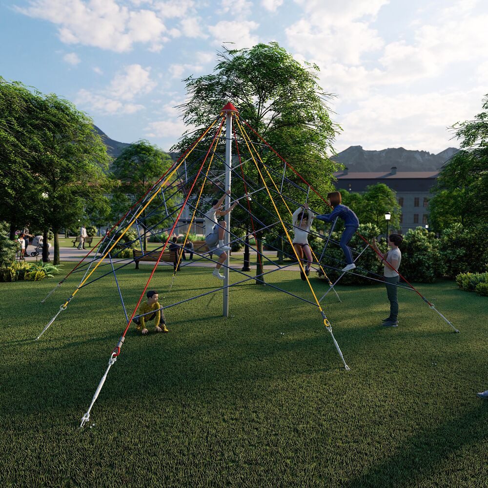 Die Huck Seilspielgeräte Seilpyramide "Super-Climb" bietet Kindern vielfältige Möglichkeiten zum Balancieren, Hangeln und Klettern und unterstützt so spielerisch die Entwicklung der motorischen Fähigkeiten. Ausgestattet mit einem stabilen Standpfosten aus verzinktem Stahl und hochwertigen Herkulsseilen mit Stahleinlage entspricht das Gerät höchsten Sicherheitsansprüchen nach EN 1176.