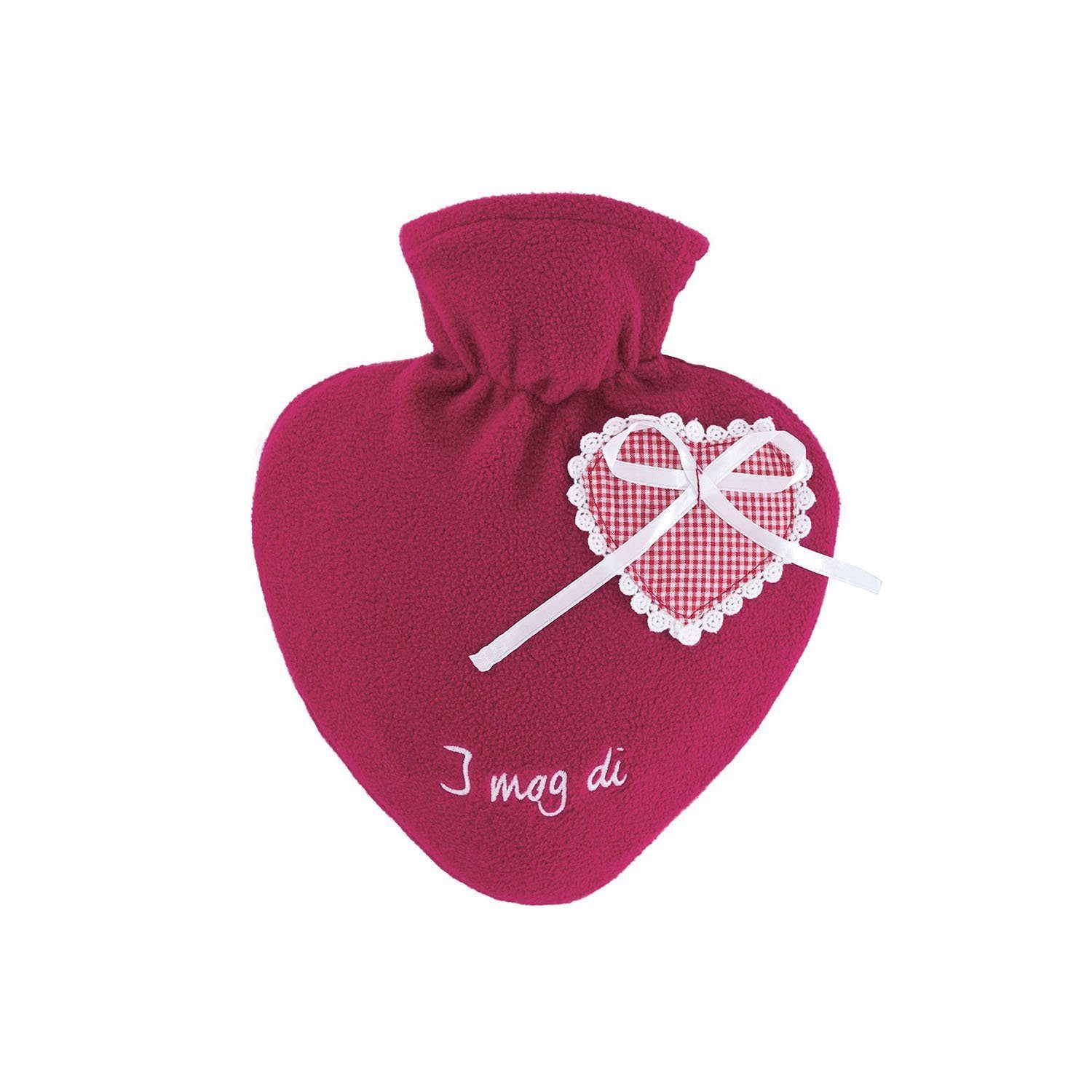 Überzug: Softer Fleecebezug rot, 100 % Polyester, mit aufwändiger Herz-Applikation und Schleife auf der Vorderseite, Stickerei „I mog di“, abnehmbar und waschbar bei 30 Grad.