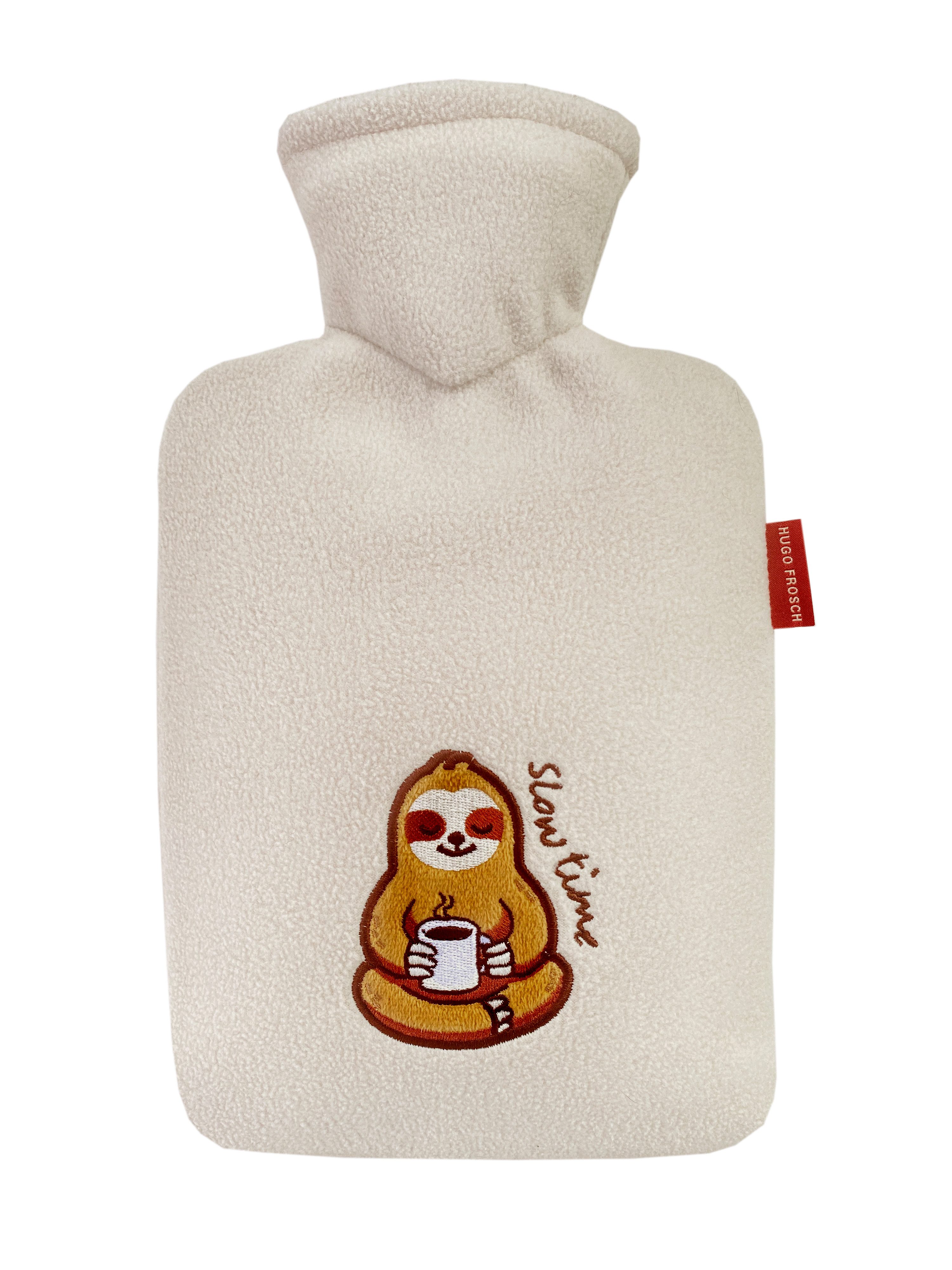 Bereits auf den ersten Blick überzeugt dieses Wohlfühlprodukt durch seinen beigen Fleecebezug, der nicht nur weich und angenehm zur Haut ist, sondern auch durch seine liebevoll gestaltete Faultier-Applikation mit der aufgestickten Botschaft „slow time“. Die Symbolik spricht für sich: Entschleunigung, Gemütlichkeit und Wärme – all das steckt in dieser besonderen Wärmflasche.