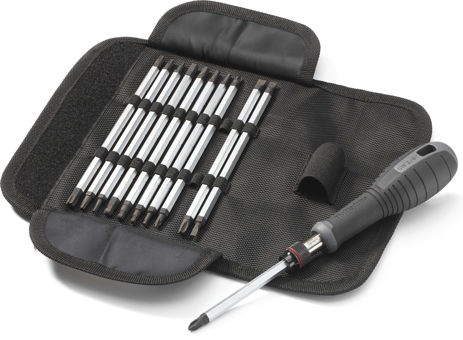 Satz langer Bits und Griff in einem praktischen Textilhalter. Entwickelt für den professionellen Einsatz zusammen mit Handwerkern. Die Bitlänge kann durch Einstecken in den Griff eingestellt werden. Enthält Schlitz-Bits 4, 5,5 und 6,5, PH 1, 2 und 3, PZ 1 und 2, Sechskant-Kugelkopf 3, 4, 5 und 6 mm, sowie Torx® T10, 15, 20, 25, 30 und 40.