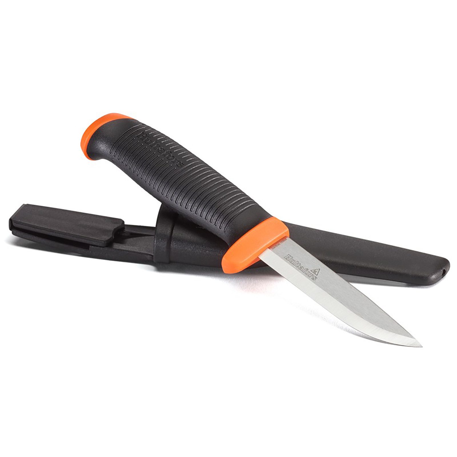 Das Handwerkermesser mit funktionellem Griff. Dieses Messer wurde für die Anforderungen von Handwerkern optimiert. Durch die einzigartige Befestigungsweise an Knöpfen der Berufskleidung kann es nicht verloren gehen und ist zugleich aber leicht abnehmbar. Die Klinge aus 2,5 mm starkem Kohlenstoffstahl hat eine Härte von 58 bis 60 HRC.