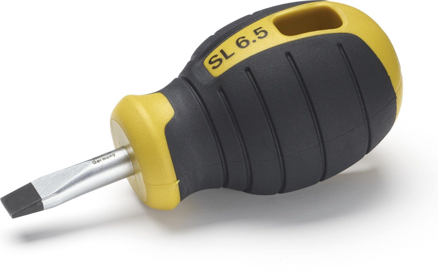 Schraubendreher mit kurzer Klinge und kompaktem Griff für besseren Zugang bei beengten Platzverhältnissen. Entwickelt für den professionellen Einsatz zusammen mit Handwerkern. Der Griff besteht aus haltbarem PPC-Kunststoff mit einer Beschichtung aus alterungsbeständigem und griffigem Gummi. Der Griff des Schraubendrehers hat ein Loch zum Aufhängen oder Sichern. Das Design des Griffs verhindert, dass der Schraubendreher auf schrägen Flächen rollt.
