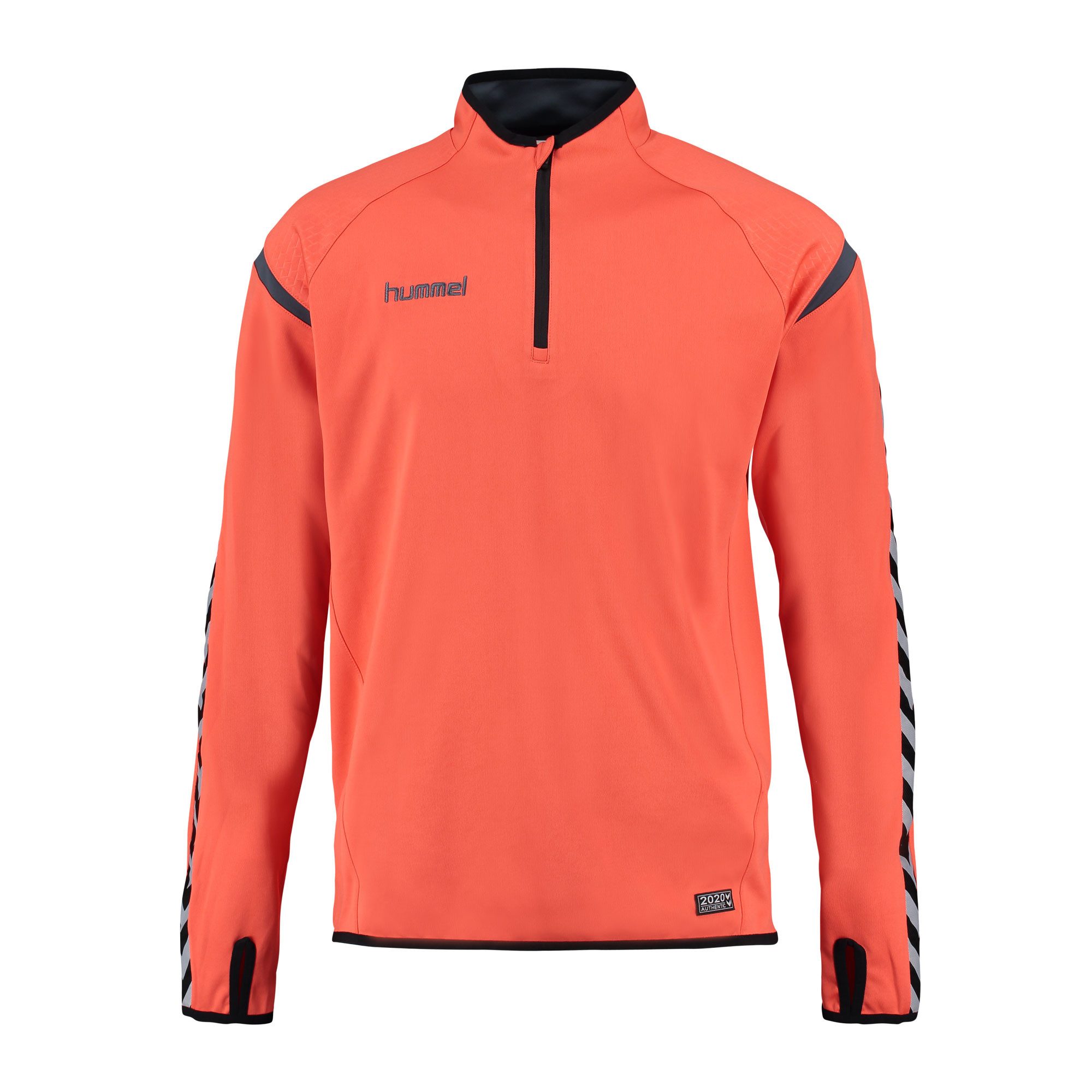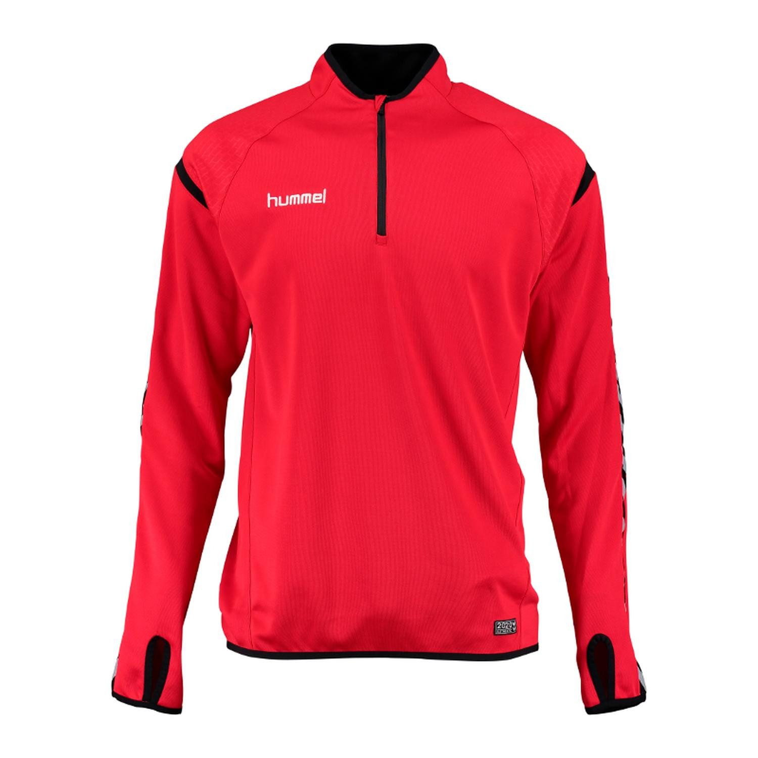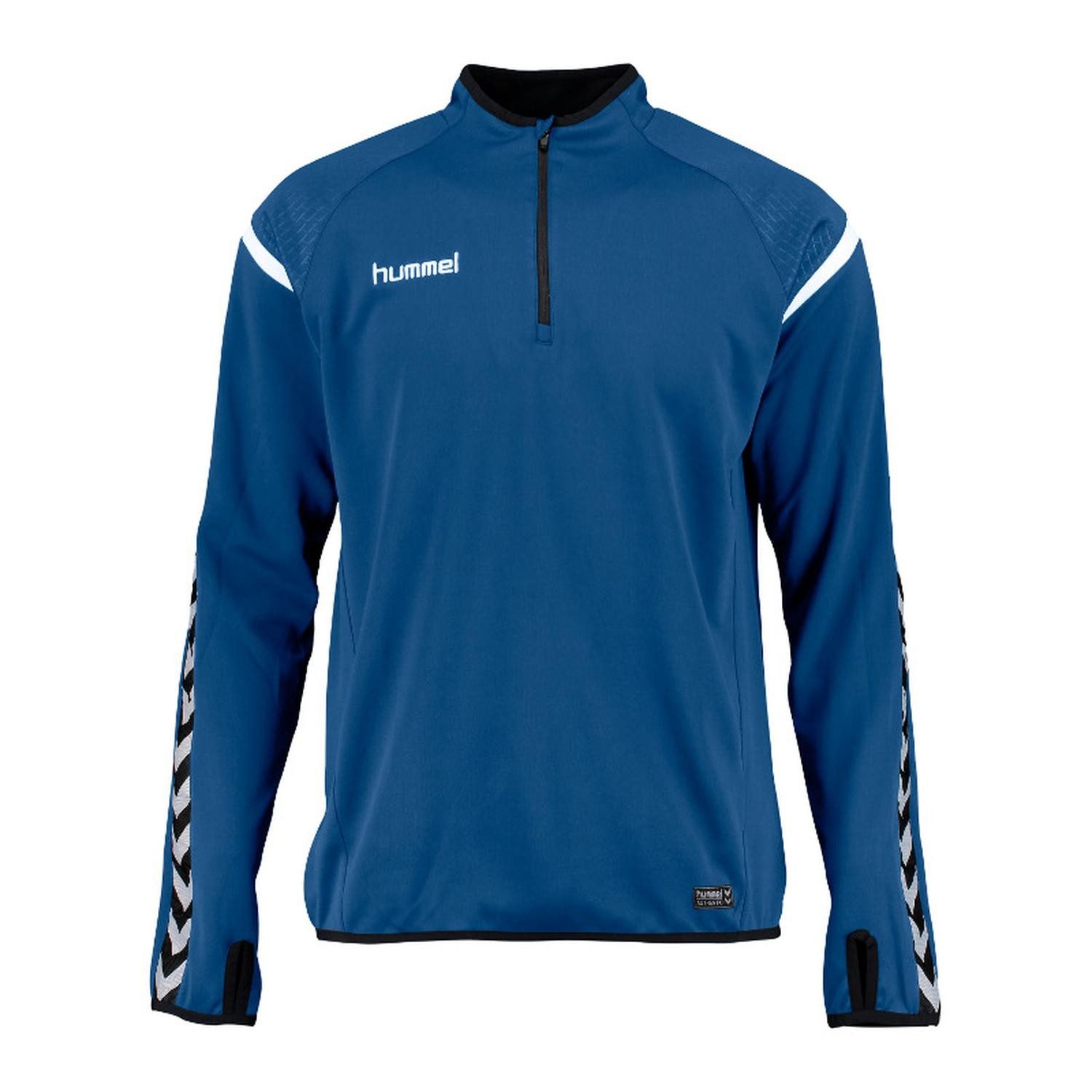 ··250 g/m², 100 % Polyester ··Gerippter Kragen und Bündchen ··1/2 Front-Reißverschluss ··Kontrastierende Materialeinsätze ··Daumenlöcher ··Gewebtes Winkelband ··Eingesticktes hummel-Logo ··Regular Fit