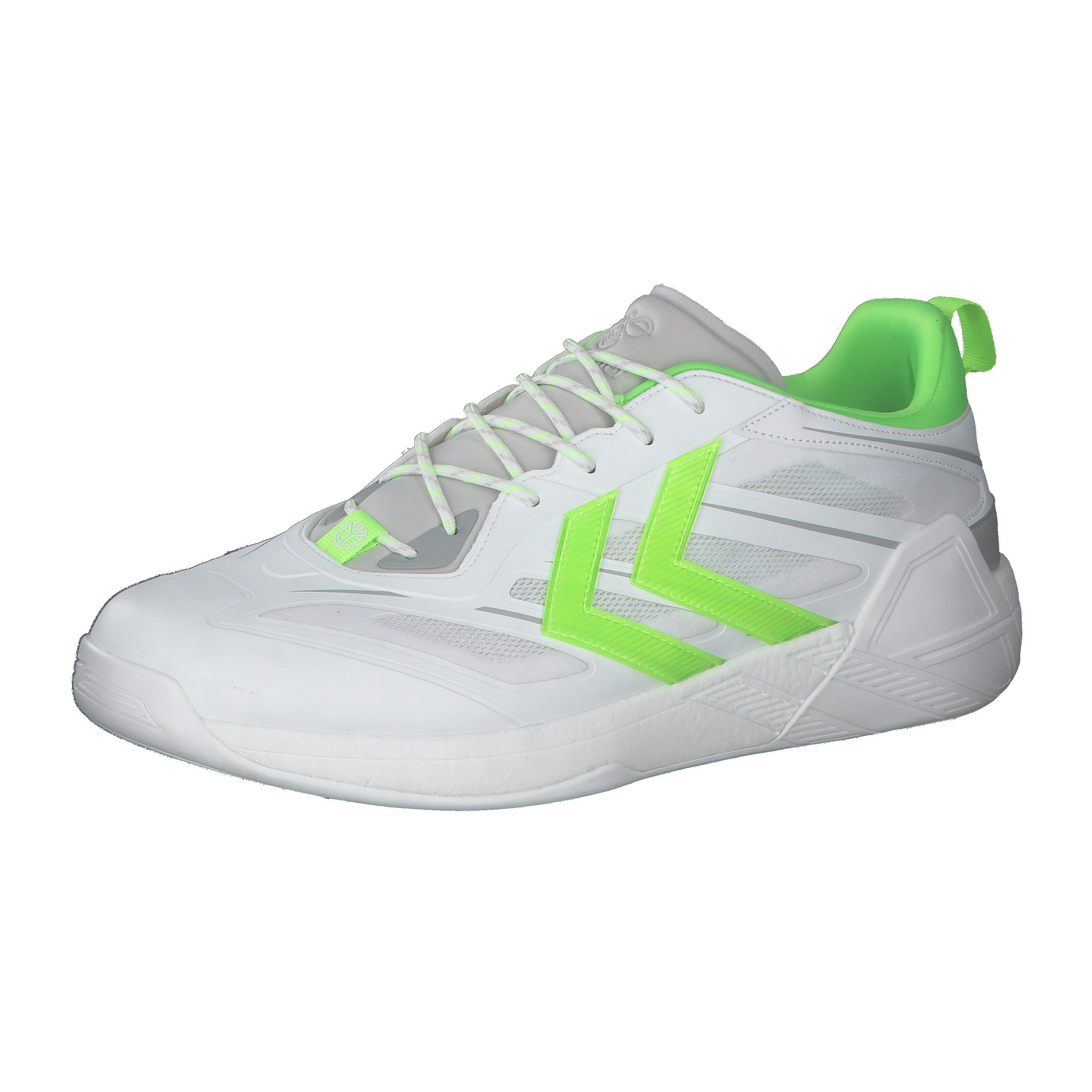 Hummel Unisex Handballschuhe Algiz 2.0 Lite. Der ALGIZ 2.0 LITE ist mit einer Vielzahl von Hightech-Leistungsmerkmalen ausgestattet, darunter eine vorgeformte, recycelte Ortholite® Innensohle. Der X-LOCK-Fersenstabilisator, das SPEEDCORE Energierückgabesystem und die TRIPLETECH Obermaterialkonstruktion dieser hummel® Schuhe garantieren Spitzenleistung, während die flexible Neoprenzunge Bewegung ermöglicht, ohne Tragekomfort zu beeinträchtigen. Diese Schuhe enthalten leichten biobasierten PEBAX® Rnew Zwischensohlenschaumstoff sowie recyceltes PET-Mesh mit TPU-Hotmelt-Verstärkungsstütze für ein bequemes und vielseitiges Trageerlebnis. Obermaterial: Sonstiges Material, Textil. Futter und Decksohle: Textil. Laufsohle: Sonstiges Material.