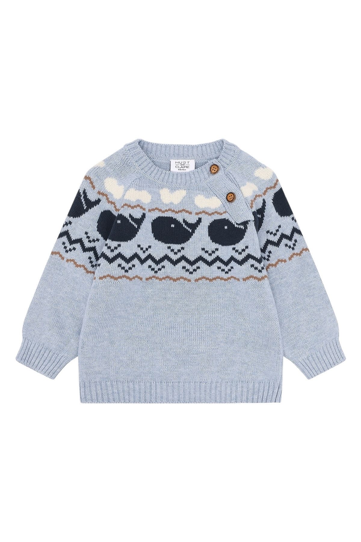 Hust & Claire Strickpullover “Pilou” – Sky Melange. Der weiche Strickpullover Pilou von Hust & Claire ist ein bezauberndes Must-have für die kühle Jahreszeit. In der zarten Farbe Sky Melange sorgt er für einen süßen Look, während das verspielte Jacquardmuster mit Walen, Wellen und Wolken eine liebevolle maritime Note verleiht. Besonders praktisch: Der Pullover verfügt über zwei Knöpfe an der Schulter, die das An- und Ausziehen erleichtern. Das hochwertige Strickmaterial sorgt für ein angenehmes Tragegefühl und hält kleine Abenteurer an kühleren Tagen schön warm. Dank der gerippten Bündchen an Ärmeln, Saum und Rundhalsausschnitt bleibt die Passform stets bequem. Ein wunderschöner Strickpullover mit niedlichem Design – perfekt für kühle Tage! Material & Pflege: • Material: Hochwertiger Strick aus weicher Baumwollmischung • Pflegehinweise: Maschinenwaschbar bei 30°C