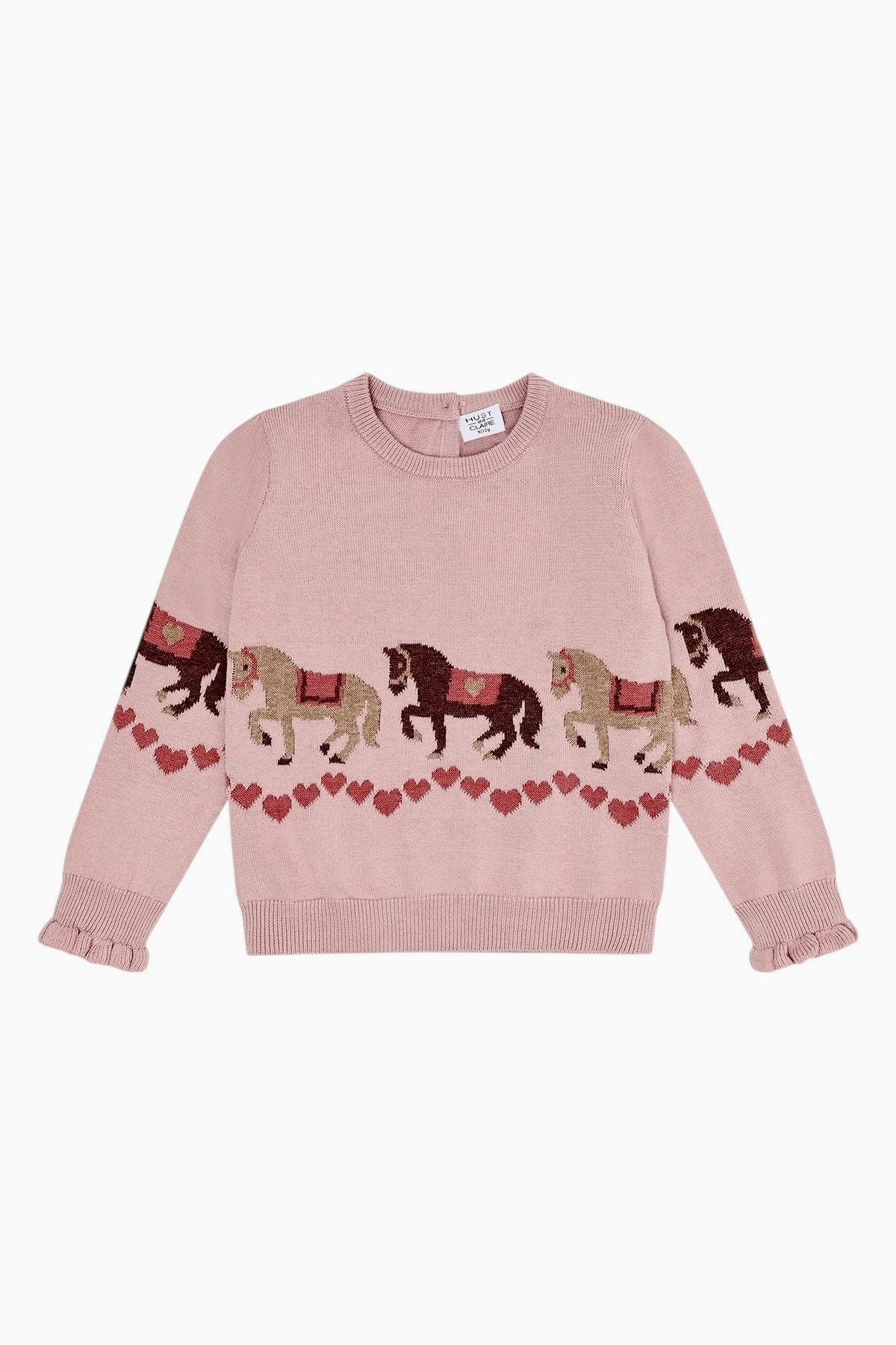 Hust & Claire Strickpullover “Pani Horse” mit Pferdemotiv, Mädchen Pullover, Rosa (Adobe Rose). Mit dem Strickpullover Pani Horse von Hust & Claire wird der Alltag für kleine Pferdefreundinnen noch schöner. Das liebevolle Jacquard-Muster mit Pferden und Herzbordüre zieht alle Blicke auf sich – ein echter Hingucker in jeder Kinder-Garderobe. Der Pullover ist aus angenehm weichem Feinstrick gefertigt und bietet optimalen Tragekomfort für Herbst, Winter oder frische Frühlingstage. Dank der Knopfleiste im Nacken lässt sich der Pulli einfach anziehen – ganz ohne Stress. Die Rüschen an den Ärmelabschlüssen geben dem Modell eine verspielte Note. Die Farbe Adobe Rose, ein zarter Roséton, macht den Pullover besonders mädchenhaft und einfach kombinierbar. Verfügbar in den Größen 98–128, perfekt für Kindergarten und Grundschule. Eingestricktes Pferdemotiv mit Herzdetails Knopfleiste im Nackenbereich Rüschen an den Ärmelabschlüssen Klassischer Rundhalsausschnitt Kindgerechte, bequeme Passform Materialzusammensetzung: 100 % Baumwolle