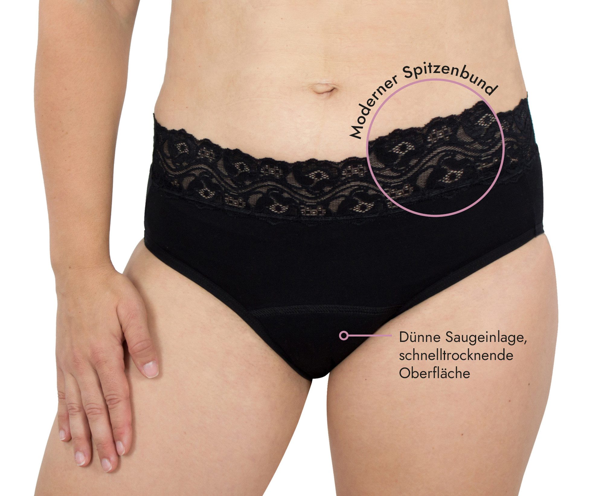 Der elegante Spitzenbund und der moderne Schnitt sorgen für eine feminine Optik, die sich kaum von normaler Unterwäsche unterscheidet. Ob als Periodenslip, bei Blasenschwäche oder im Wochenbett – der Hydas Hygieneslip verbindet Sicherheit mit Stil.