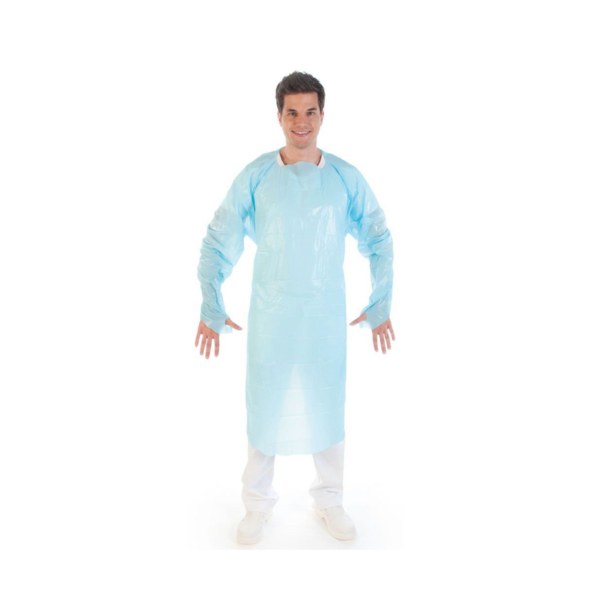 Der Hygostar Untersuchungskittel mit Daumenloch in Blau ist aus hochwertigem Cast Polyethylen (CPE) gefertigt. Dieser Einwegkittel ist ideal für den Einsatz in medizinischen Einrichtungen, wie Krankenhäusern und Pflegeheimen, wo Schutz vor Flüssigkeiten und Kontaminationen erforderlich ist. Das CPE-Material ist robust, wasserdicht und bietet optimalen Schutz gegen Viren, gemäß der EN 14126-Norm. Der Kittel verfügt über praktische Daumenlöcher, die zusätzlichen Halt bieten und das Verrutschen des Kittels verhindern.