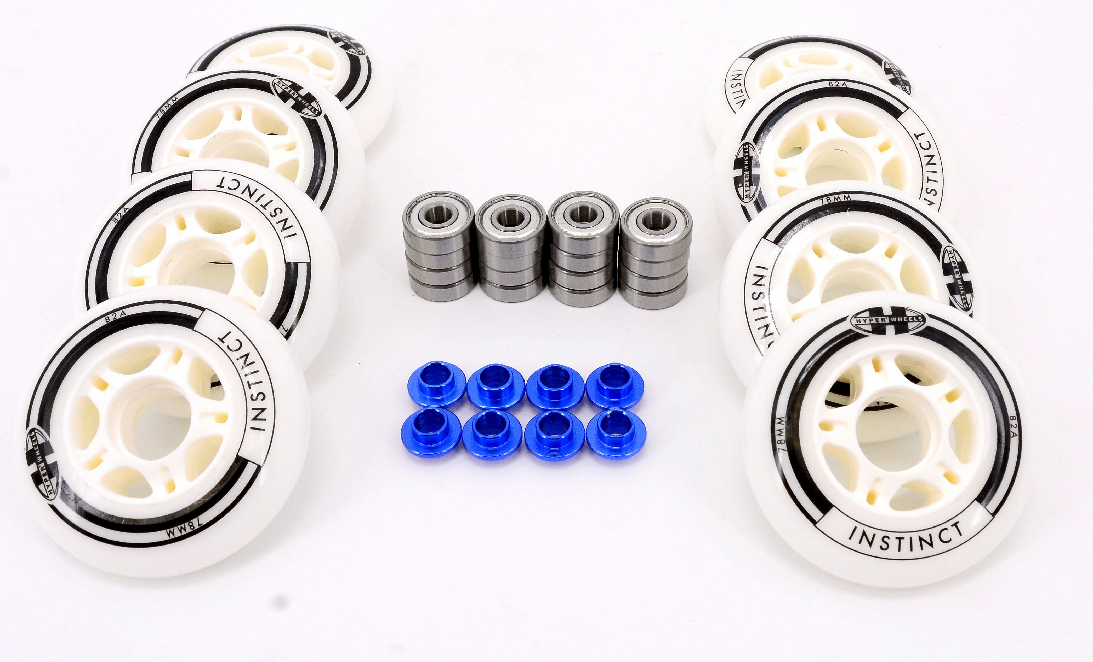 Instinct 78mm / 82A Die Rolle mit dem schnellem Rollenprofil ermöglicht maximalen Speed auf der Geraden und super Grip auf der Straße. Fitness Rolle für das Skating auf harten Untergründen wie Asphalt und Beton, sehr gut geeignet für lange Strecken. Mit nur 24mm Radbreite ist die Rolle sehr agil und leicht. Sie bekommen hier die Rollen fertig montiert mit ABEC 7 Kugellagern und 8mm Aluminium Spacern. Bitte beachten: Dieses Set passt nur, wenn Ihre Achsen 8mm Durchmesser haben und die Skates vom Hersteller für 78mm Rollen freigegeben sind!
