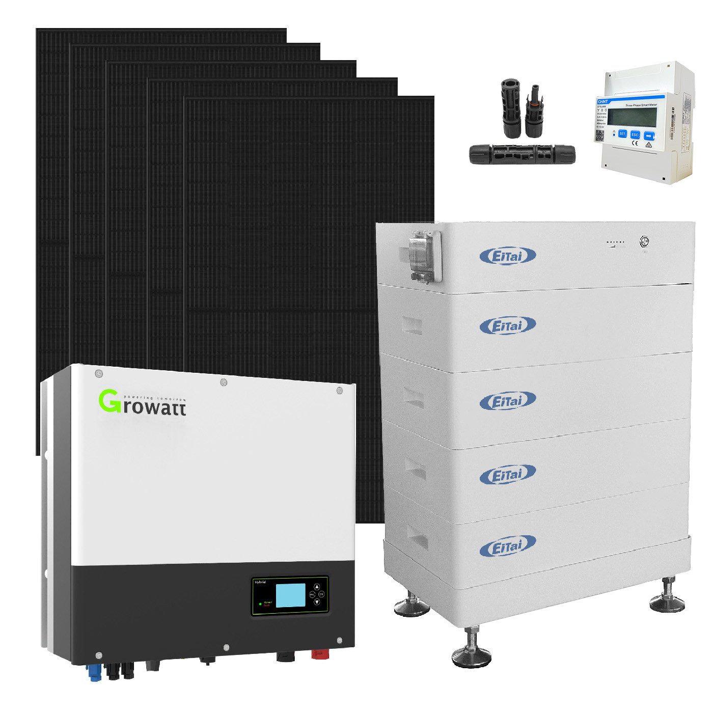 Lieferumfang | 24 Stück 440W Solarmodule 1x Growatt SPH 10000TL3-BH-UP Wechselrichter 1x LiFePo-Hochspannungsbatterie 15x MC-Steckverbinder WiFi-Stick Smartmeter 250A/50mA |
