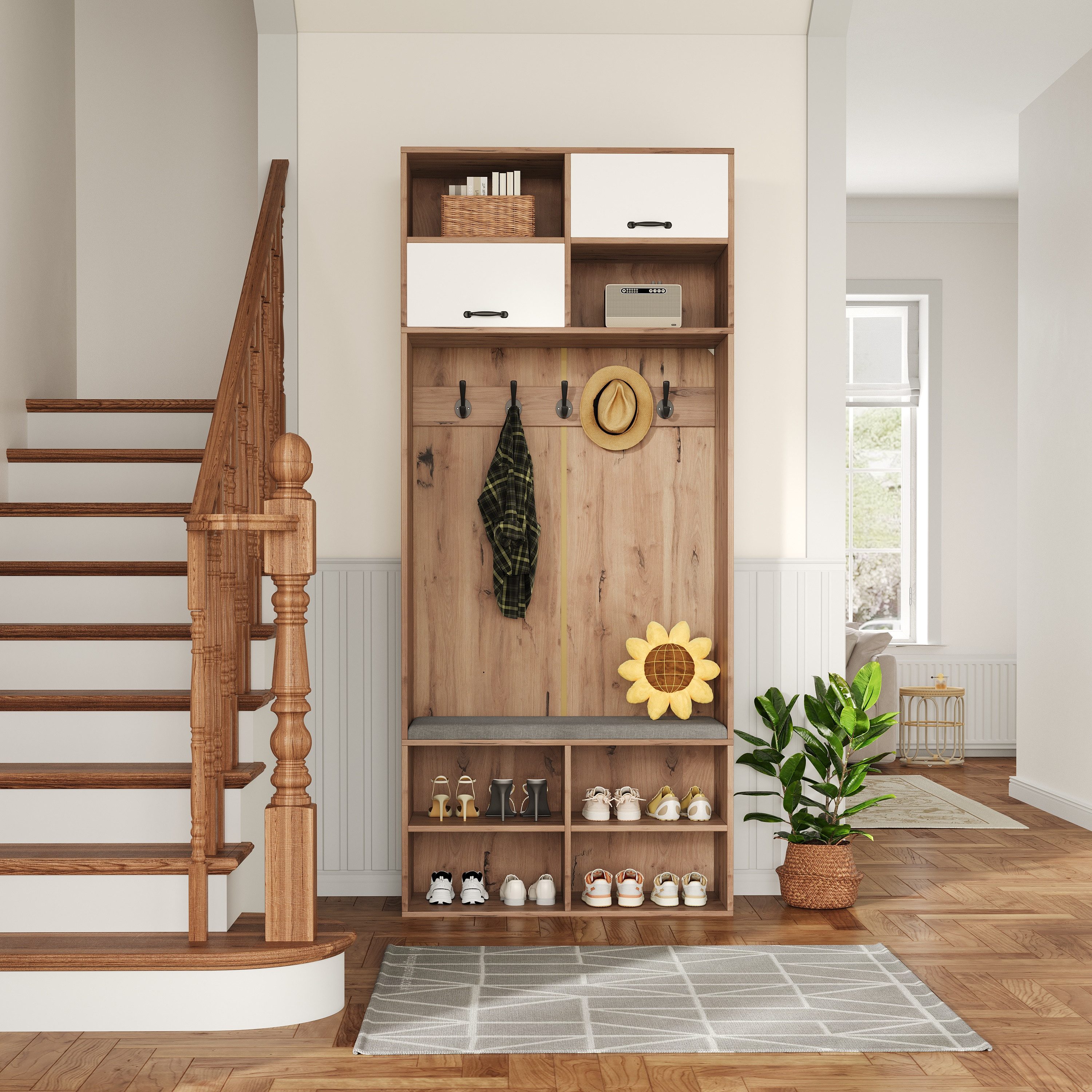 Stabile Sitzbank mit Komfort: Die integrierte Sitzbank ist mit einer weichen, gepolsterten Innensohle ausgestattet, die das An- und Ausziehen von Schuhen besonders bequem macht. Die Bank ist aus hochwertigen Materialien gefertigt und trägt bis zu 90 kg (198 Pfund), was Langlebigkeit und Stabilität garantiert.