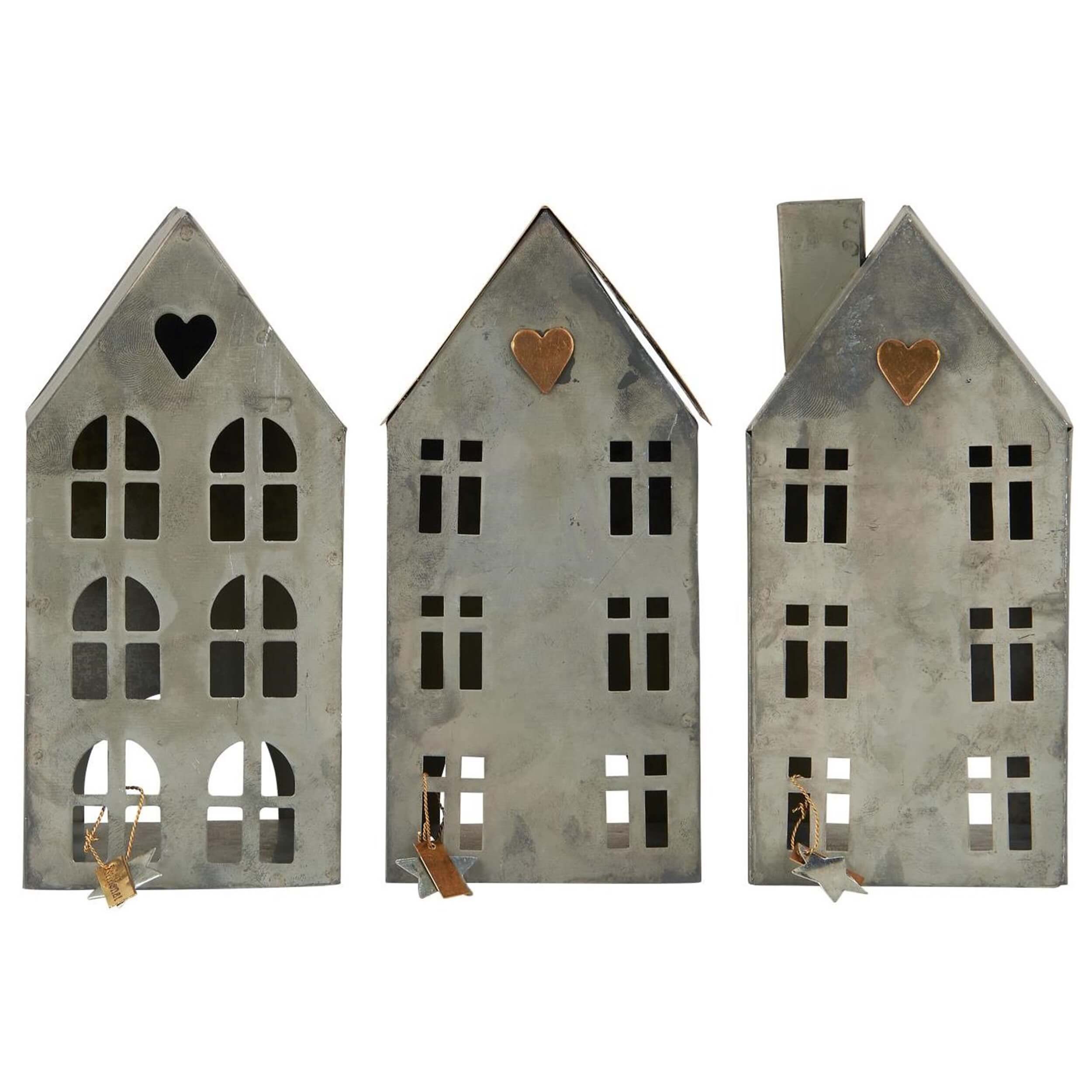 Schaffen Sie die perfekte Weihnachtsstimmung mit diesem wunderschönen 3er Set aus Teelicht Häuschen, die aus Metall gestaltet sind. Tun Sie ein Teelicht oder eine Lichterkette hinein, sodass Licht durch die kleinen Fenster scheinen kann.