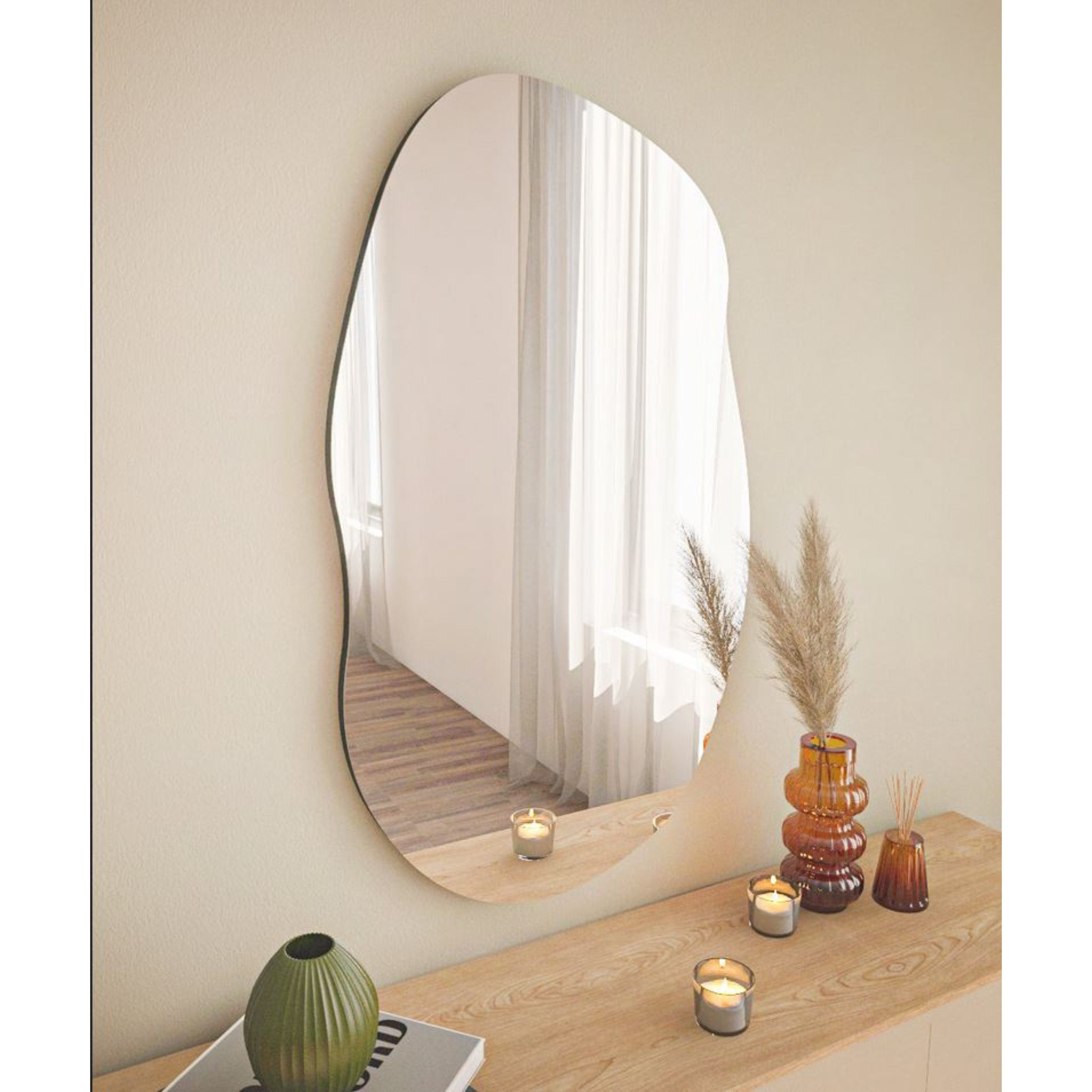 Seine unregelmäßige Form macht ihn zu einem echten Hingucker und einer hervorragenden Alternative zu herkömmlichen, rechteckigen Spiegeln. Mit seinem großzügigen Sichtfeld bietet er nicht nur Funktionalität, sondern auch ein dekoratives Element, das sich harmonisch in verschiedene Einrichtungsstile einfügt.