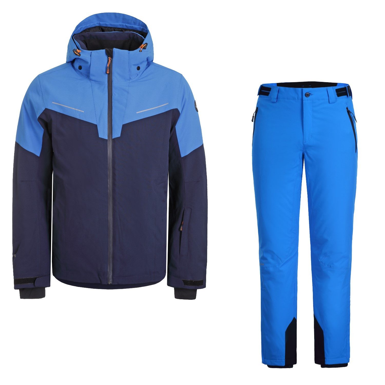 Schöne und funktionaler ,Icepeak Skianzug für Herren mit einer 10.000mm Wassersäule. Die Icepeak Jacke ist Warm gefüttert und ist dank ihrer verschweißten Nähten Wasserdicht. ,Eine verstellbare und abnehmbare Kapuze schützt dich auch bei stürmischen Tagen sicher vor dem Wind, ,Regen und Schnee. ,Hochschließender, wasserdichter Reißverschluss und ein Stehkrangen mit Microfleece Futter sowie ,dieverse verschließbare Taschen für die wichtigsten Dinge. Der Saum lässt sich in der Weite verstellen. Die Hose hat ebenfals eine 10.000mm Wassersäule und verschweißte Nähte. Vorgeformte Knie für optimale Bewegungsfreiheit. ,