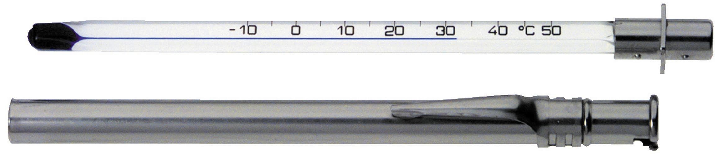 Das Taschen-Thermometer in Stabform ist komplett mit Hülse und somit leicht aufzubewahren und mitzunehmen. Dank der Kapilarform, die weißbelegt und prismatisch ist, sowie der blauen Anzeigeflüssigkeit ist das Ablesen der Temperatur besonders einfach.
