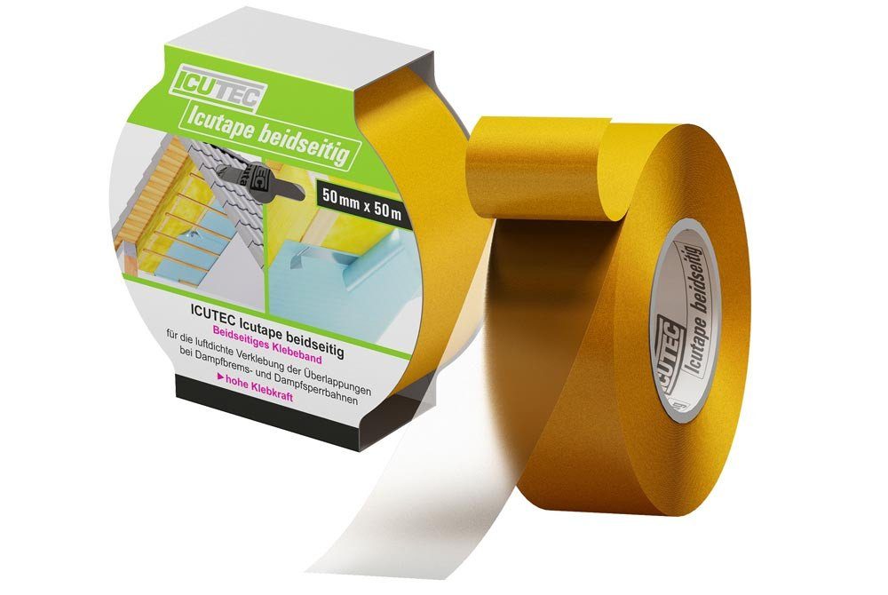 Das Klebeband ICUTEC Icutape beidseitig wird eingesetzt um Dampfbremsfolien, Dampfsperrfolien, praktisch dampfdichte Folien und Luftdichtungen zwischen der Überlappung zu verkleben. Hierdurch wird die Luftdichtheit, Dampfbremswirkung, Dampfsperrwirkung bzw. Dampfdichtheit hergestellt. Der Einsatz des ICUTEC Icutape beidseitig ist universell in den Gewerken Steildach, Flachdach und Trockenbau möglich.