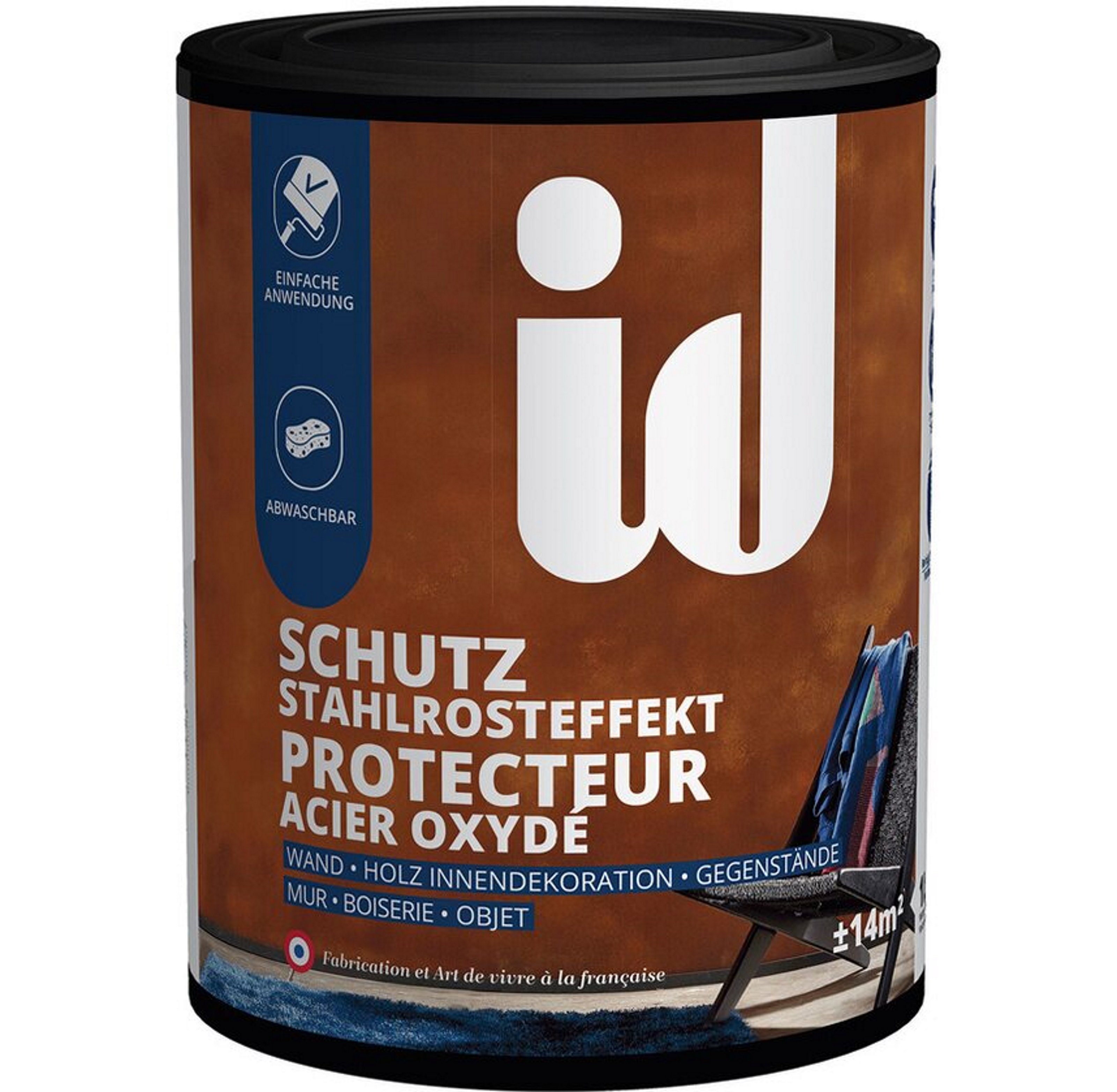 id Creative Colors / id Paris Schutz Stahlrosteffekt 1 Liter Der Schutz Stahlrosteffekt ist ein seidenmatter, transparenter Schutzanstrich auf Wasserbasis unerlässlich, um den Rosteffekt zu fixieren, zu schützen und ihn abwischbar zu machen. Der Schutz Stahlrosteffekt fixiert den Rosteffekt nach der Anwendung mit Stahlrosteffekt Putz und Oxidationsmittel. Vorteile: Einfache Anwendung und Abwaschbar. Untergründe: Wand, Holz Innendekoration und Gegenstände. Anwendung: Roller. Vor dem Auftragen gut durchrühren. Nach dem Auftragen des Oxydationsmittels mindestens 24 Stunden warten, bevor der Schutz aufgetragen wird. Eine Schicht mit dem Schaumstoffroller auftragen und in alle Richtungen unregelmäßig verstreichen. Dann 4 Stunden trocknen lassen. Für verbesserten Schutz, wenden Sie eine zweite Schicht an. Wichtig: Der Schutz hat eine weißliche Wirkung an der Wand, die beim Trocknen verschwindet. Trocknung: Ca 4 Stunden. Reinigung der Werkzeuge: Mit Wasser. Ergiebigkeit: 1 Liter reichen für ca. 14m².
