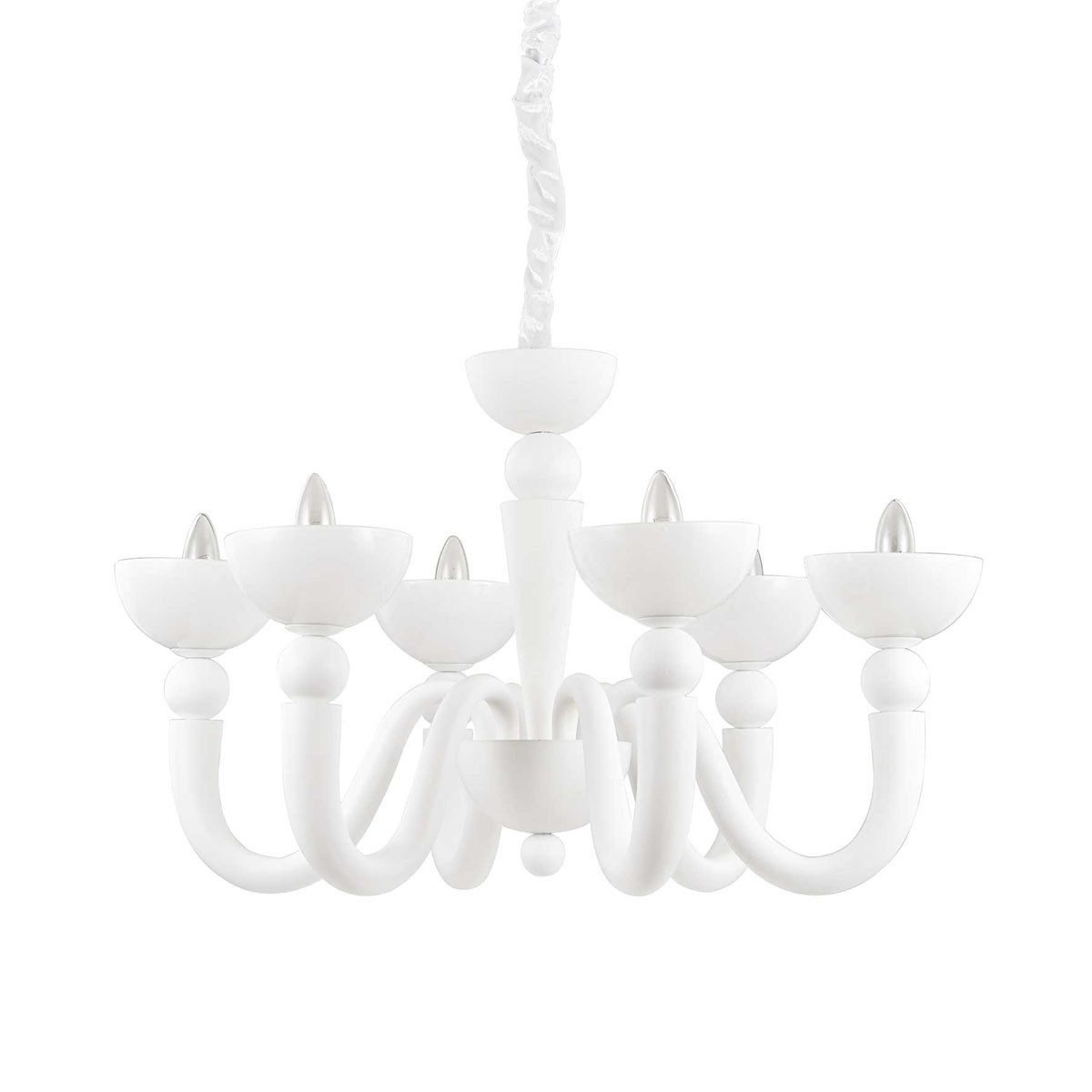 Der Kronleuchter Bon Bon von Ideal Lux kombiniert eine verspielte Silhouette mit edler Назадhaltung. Die geschwungenen Metallarme greifen die klassische Form des Lüsters auf, interpretieren sie aber mit moderner Leichtigkeit. Dadurch entsteht ein eindrucksvolles Lichtobjekt mit zeitgemäßer Wirkung.