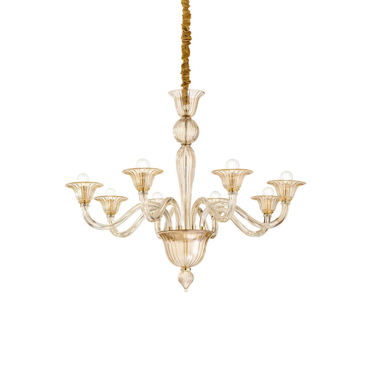 Der Brigitta Kronleuchter von Ideal Lux bringt nostalgisches Flair und warme Eleganz in Ihr Zuhause. Sein Design erinnert an klassische Murano-Leuchter, kombiniert mit modernen Materialien in edler Farbgebung. Die bernsteinfarbenen Glasarme und Tropfen verleihen dem Raum eine außergewöhnliche Tiefe und ein stimmungsvolles Lichtspiel.