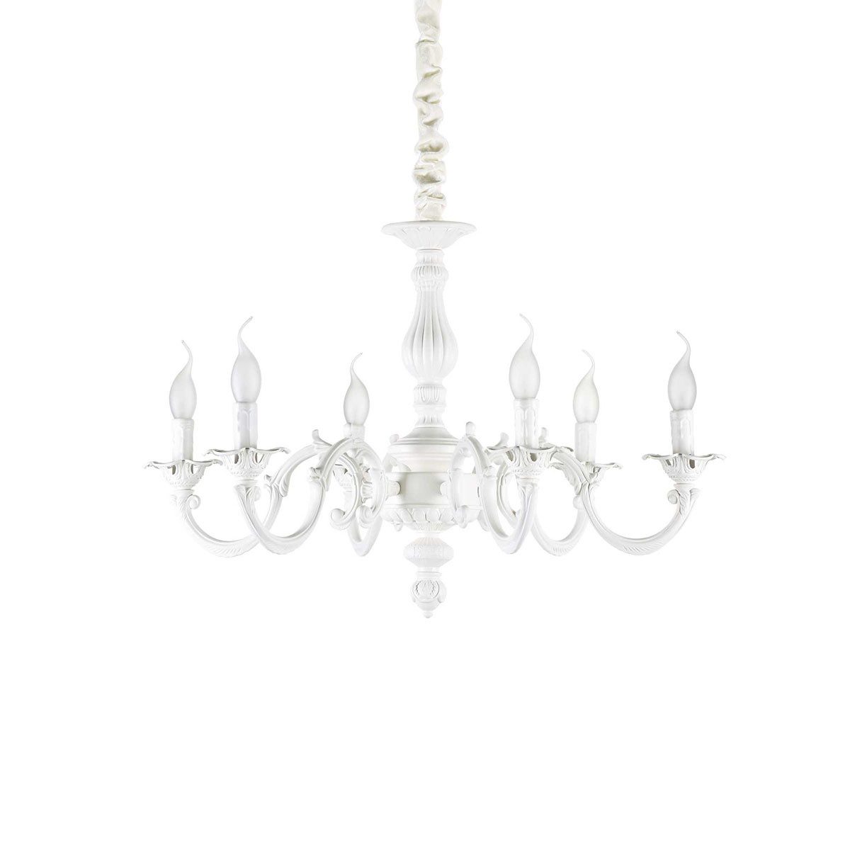 Der Ideal Lux Justine Kronleuchter präsentiert sich in strahlendem Weiß und überzeugt mit filigran verzierten Gussarmen, die in sanften Blattformen enden – ein Designstück, das klassische Wohnstile und moderne Eleganz vereint.