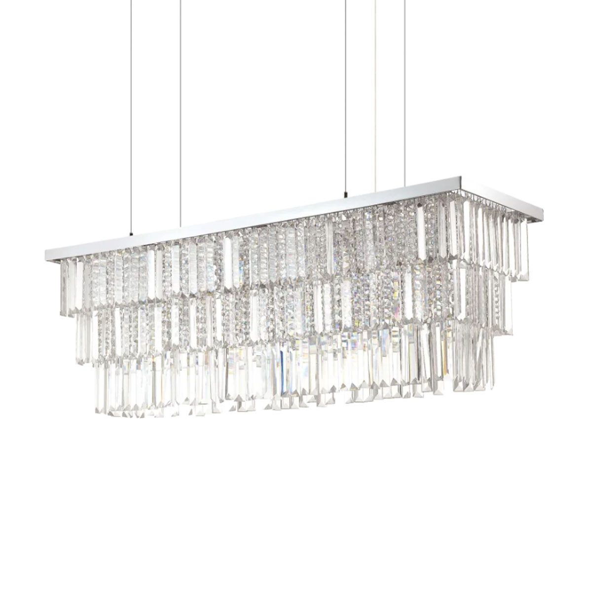 Der Ideal Lux Martinez SP8 Kronleuchter besticht durch sein modernes rechteckiges Design und hochwertige Verarbeitung. Das Metallgestell ist wahlweise in glänzendem Chrom oder edlem Gold erhältlich und harmoniert perfekt mit den transparenten Kristallstäben und filigranen Achteck-Ketten. Diese Pendelleuchte verleiht jedem Raum eine luxuriöse Atmosphäre.