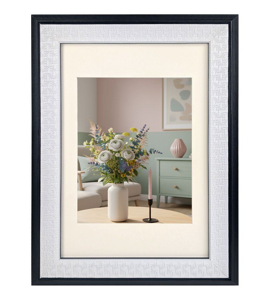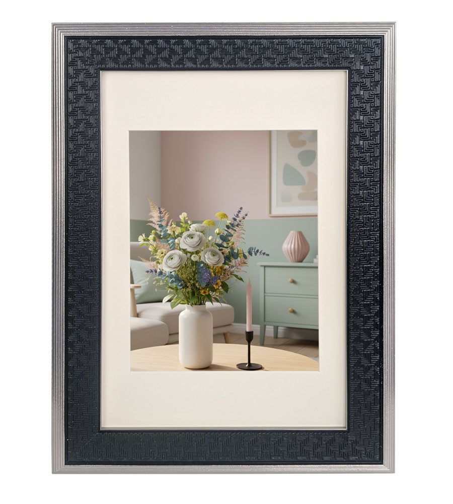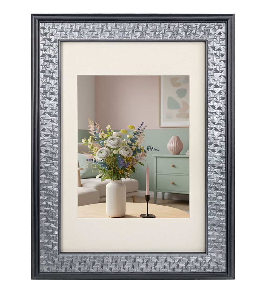 Der Bilderrahmen 15x20 cm mit seiner fein strukturierten, geometrisch geprägten Leiste ist ein echtes Designstatement. Die strukturierte Oberfläche erzeugt je nach Lichteinfall einen dezenten Glanz, der deinem Bild Tiefe und Charakter verleiht. Erhältlich in den edlen Farben Schwarz, Silber und Weiß-Silber, passt dieser Rahmen sowohl in moderne als auch klassische Einrichtungen.