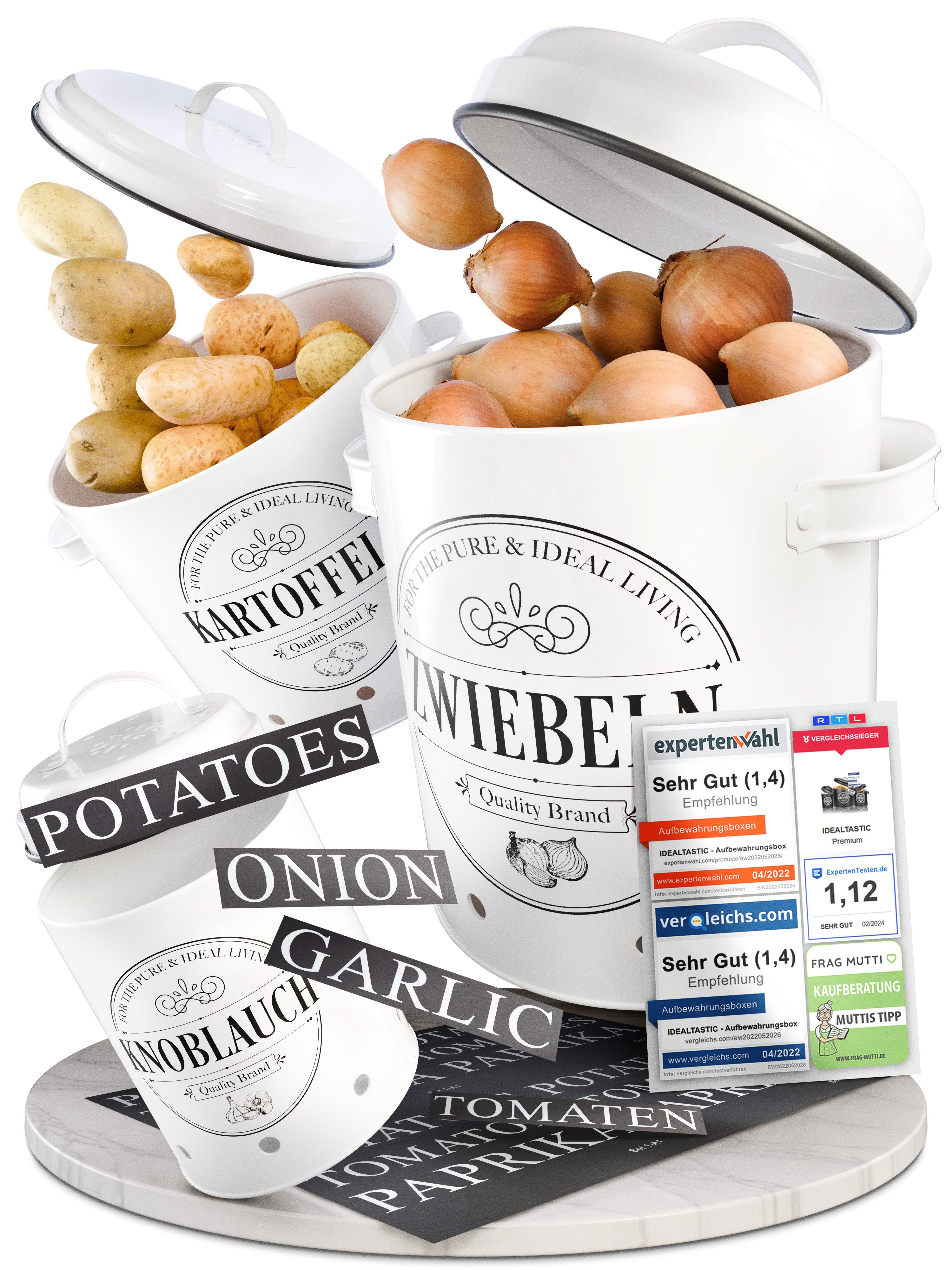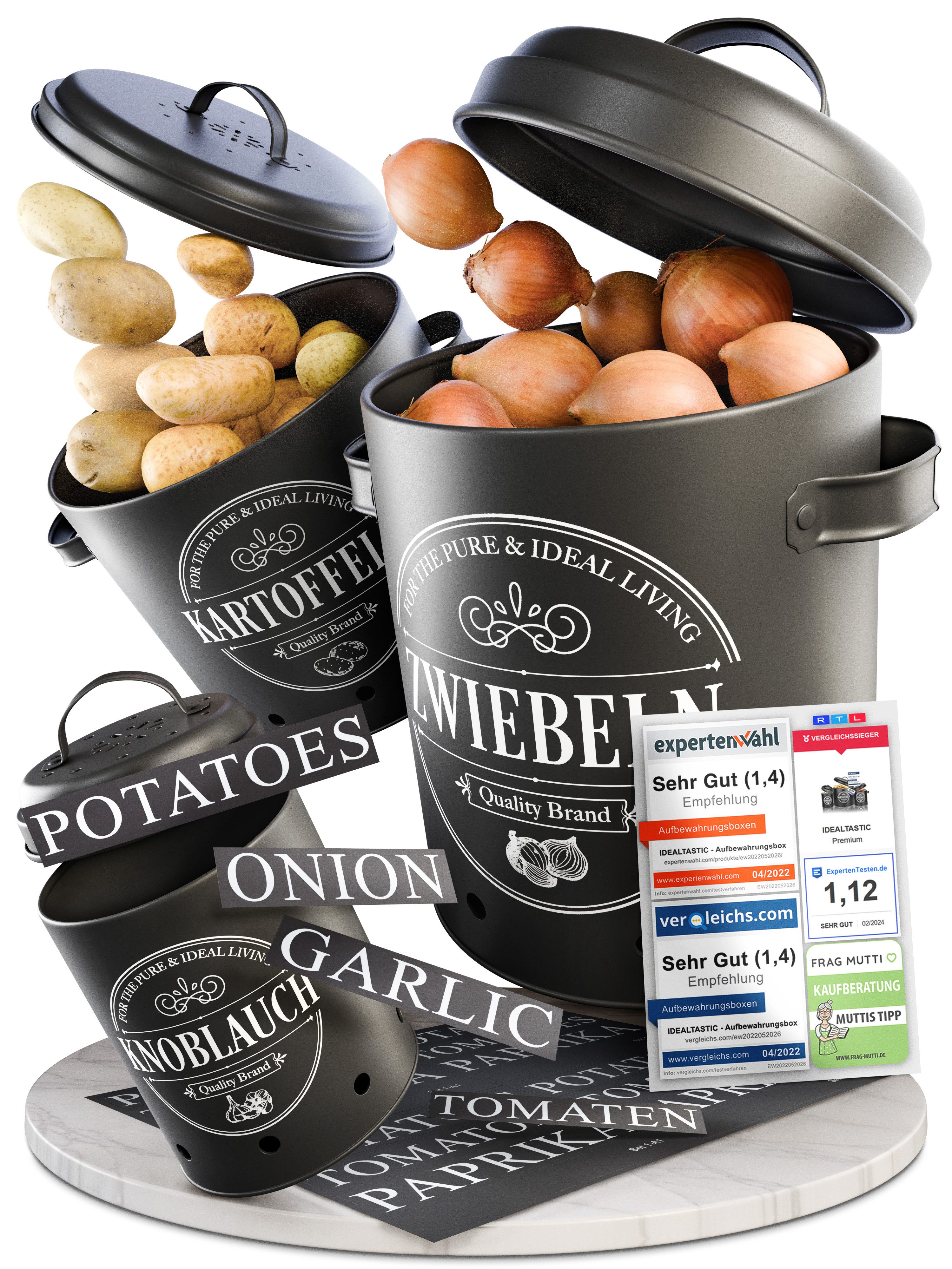 Ausstattung | Luftlöcher, Deckel, 360 Grad Belüftungssystem, Kartoffel Aufbewahrungsbox , Zwiebel- & Gemüsebehälter, 3-teiliges Vorratsdosen-Set, Für Kartoffeln, Zwiebeln & Knoblauch |