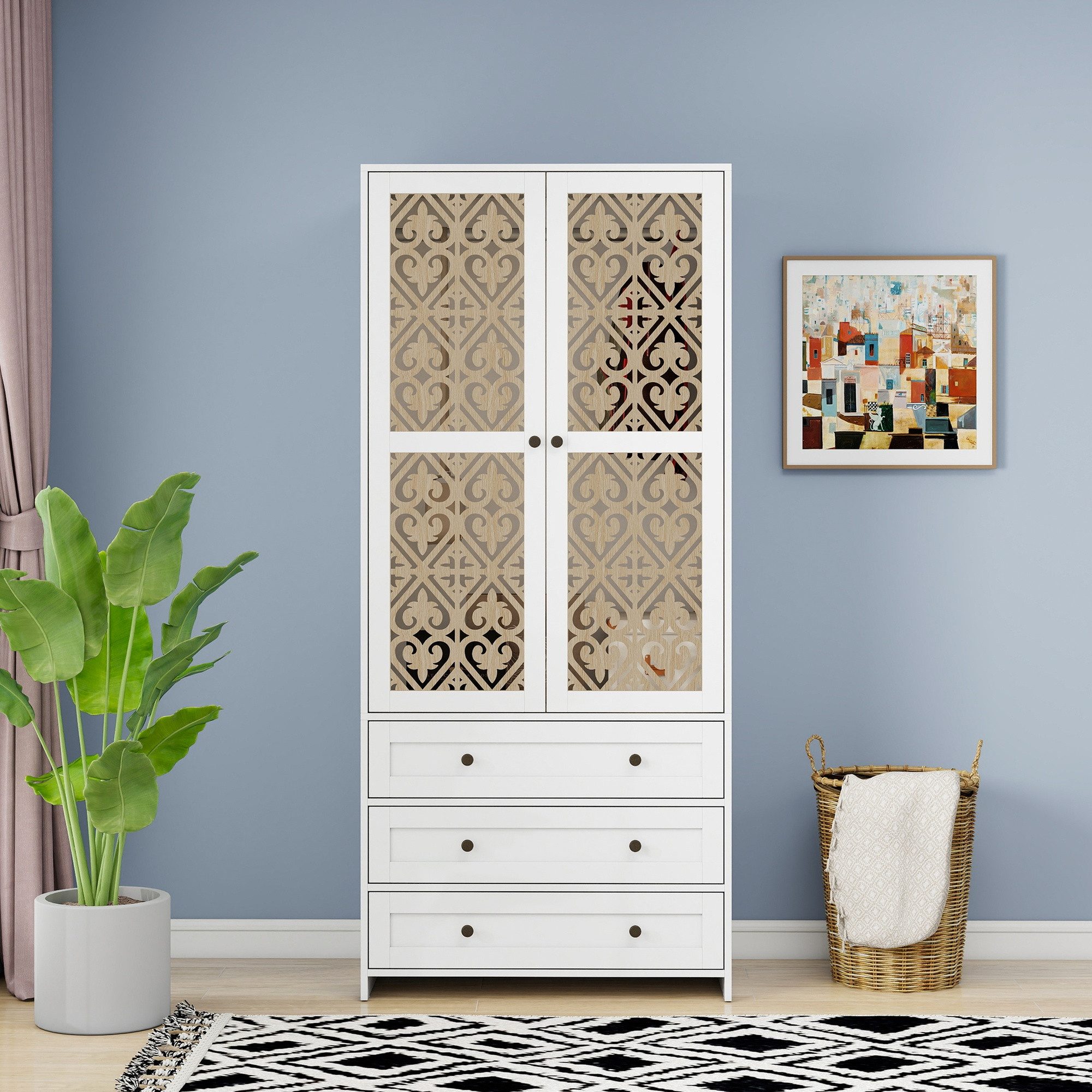 Der Garderobenschrank kombiniert stilvolle Doppeltüren mit dekorativen Ausschnittmustern und praktischen Schubladen – ideal zur Aufbewahrung von Schuhen, Accessoires oder Haushaltsutensilien. Die verlängerte Kleiderstange ermöglicht das platzsparende Aufhängen langer Mäntel oder Kleider, während der großzügige Stauraum Ordnung in Ihrem Flur schafft.