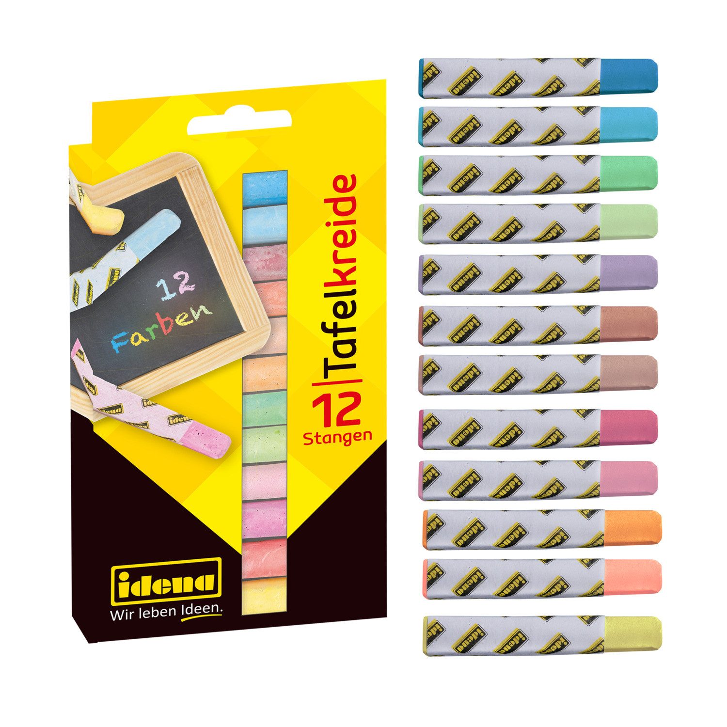Die Idena Tafelkreide in bunten Farben ist das perfekte Werkzeug zum Schreiben und Malen auf Tafelflächen! Die Packung enthält 12 Kreidestangen in unterschiedlichen Farben, die angenehm in der Hand liegen. Da