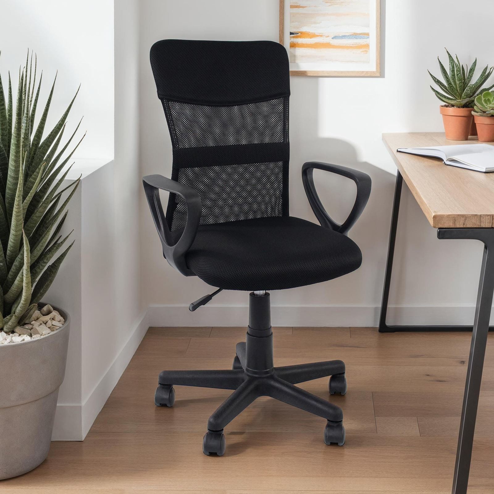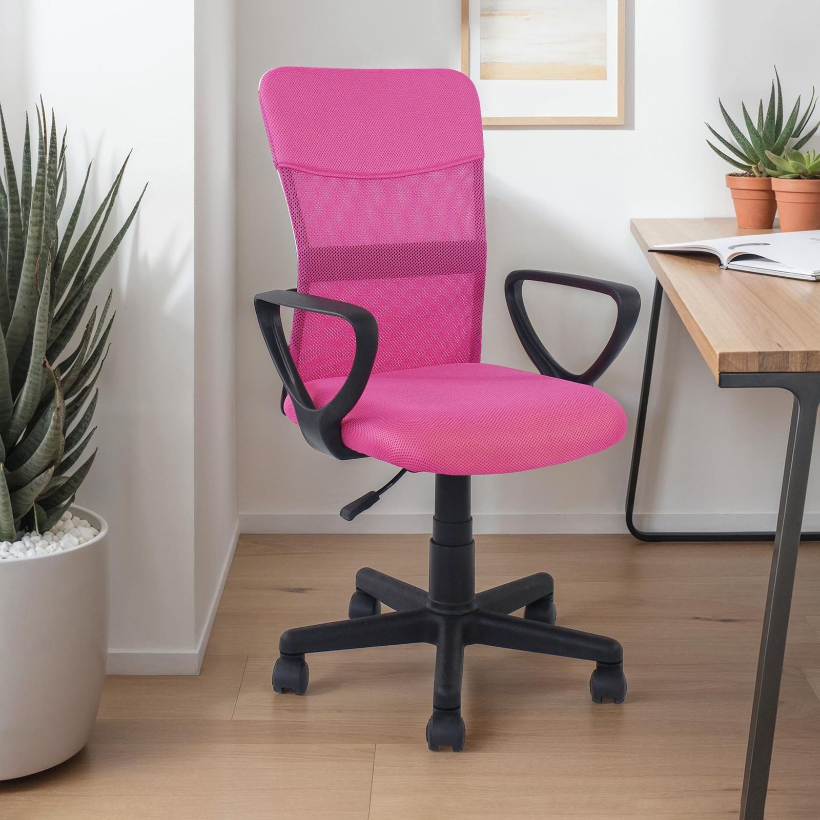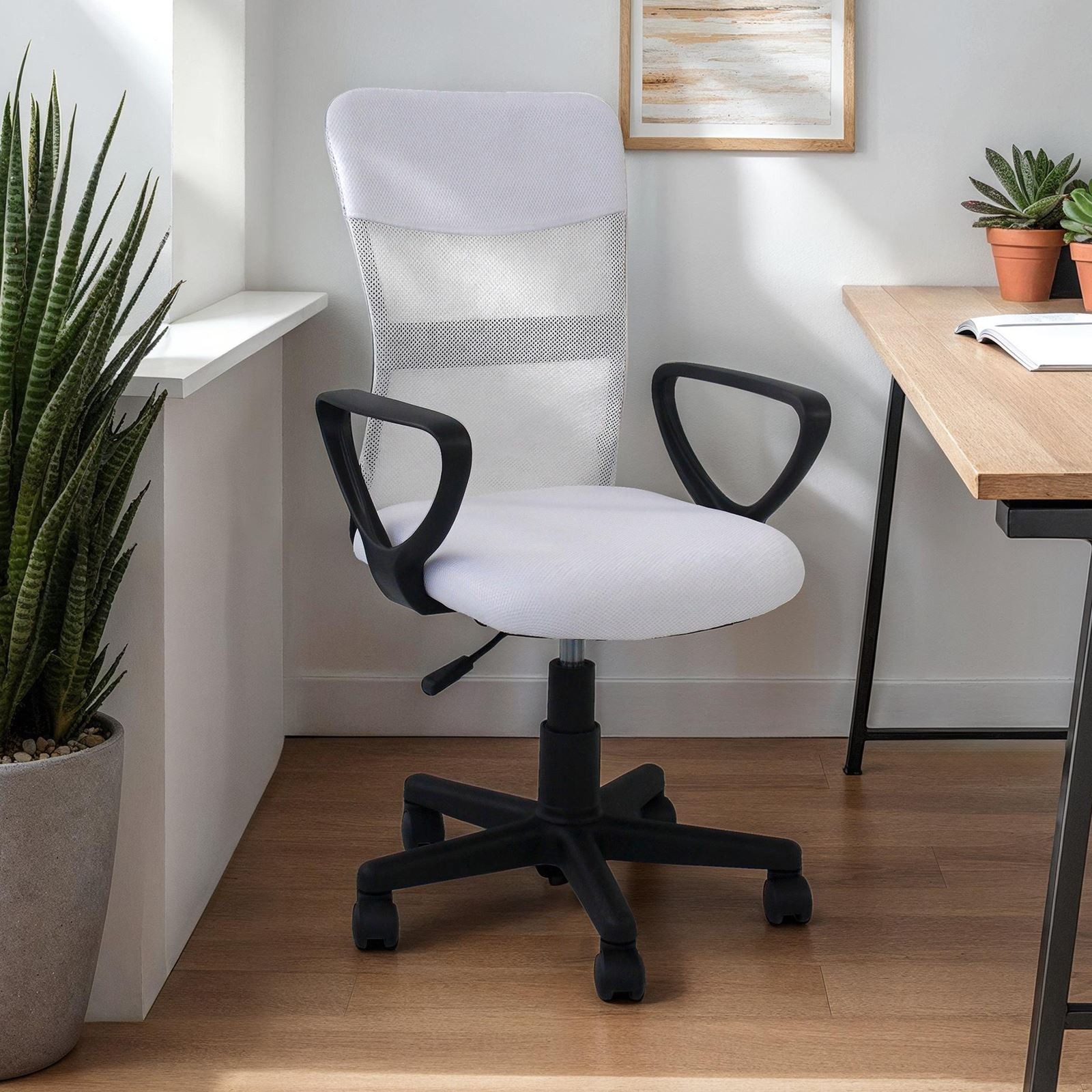 Der drehbare Schreibtischstuhl Jogo vereint ergonomische Funktionalität mit stilvollem Design. Die gepolsterte Sitzfläche sorgt für bequemes Sitzen, während die atmungsaktive Mesh-Rückenlehne ein angenehmes Sitzklima bietet. Dank der stufenlosen Höhenverstellung lässt sich die Sitzhöhe individuell anpassen. Die stabilen Armlehnen entlasten die Schultern, und die leichtgängigen Rollen eignen sich für alle Böden. Perfekt für Büro, Home Office oder Arbeitszimmer