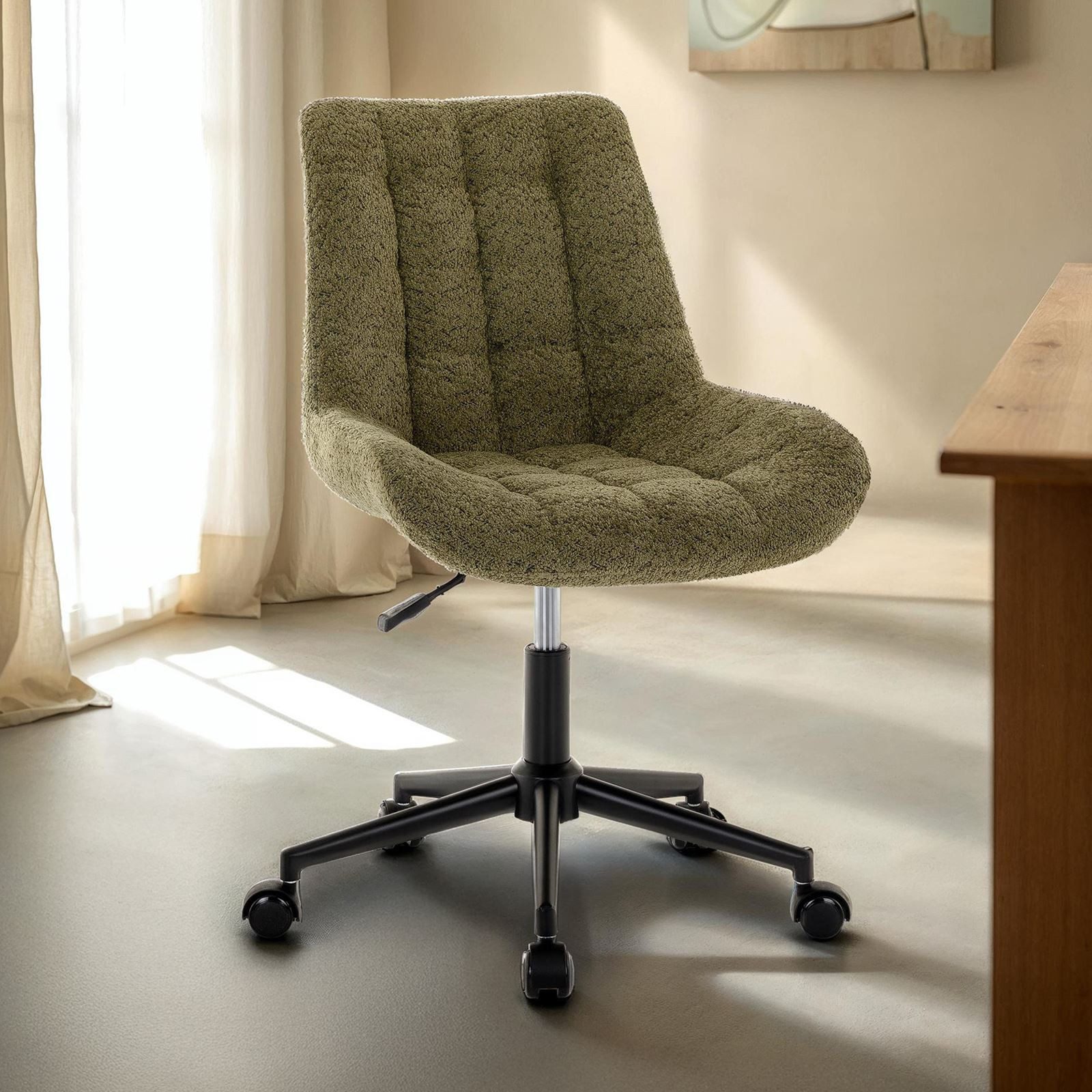 Der Schreibtischstuhl Task kombiniert modernes Design mit Funktionalität und einem angenehmen Sitzkomfort. Mit seinem eleganten Bezug aus grünem Bouclé Stoff bringt er eine stilvolle und gemütliche Atmosphäre in jedes Arbeitszimmer oder Home-Office. Der Bouclé Stoff besticht durch seine weiche, strukturierte Oberfläche, die besonders langlebig und strapazierfähig ist. Dieser Stoff ist nicht nur angenehm, sondern auch pflegeleicht, was den Stuhl zu einer idealen Wahl für den täglichen Einsatz macht. Die Sitzhöhe lässt sich individuell anpassen, während die fünf leichtgängigen Doppelrollen für maximale Beweglichkeit sorgen. Dank des stabilen Metallgestells bietet der Stuhl eine hohe Belastbarkeit und Zuverlässigkeit.