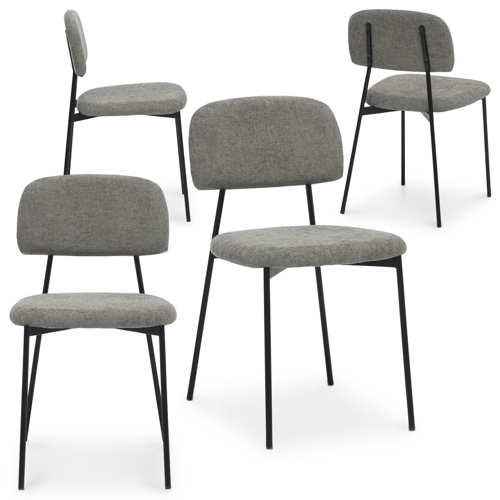 Dieses stilvolle Stuhl-Set bringt modernen Komfort in Ihren Essbereich. Die vier bequemen Stühle verfügen über eine weiche Polsterung mit Stoffbezug und überzeugen durch ihr klares, zeitloses Design. Dank des stabilen Eisengestells in Schwarz und der neutralen Polsterung in Hellgrau fügen sie sich harmonisch in verschiedenste Esszimmermöbel ein. Perfekt geeignet als Set für den Essbereich oder als Küchenstühle.