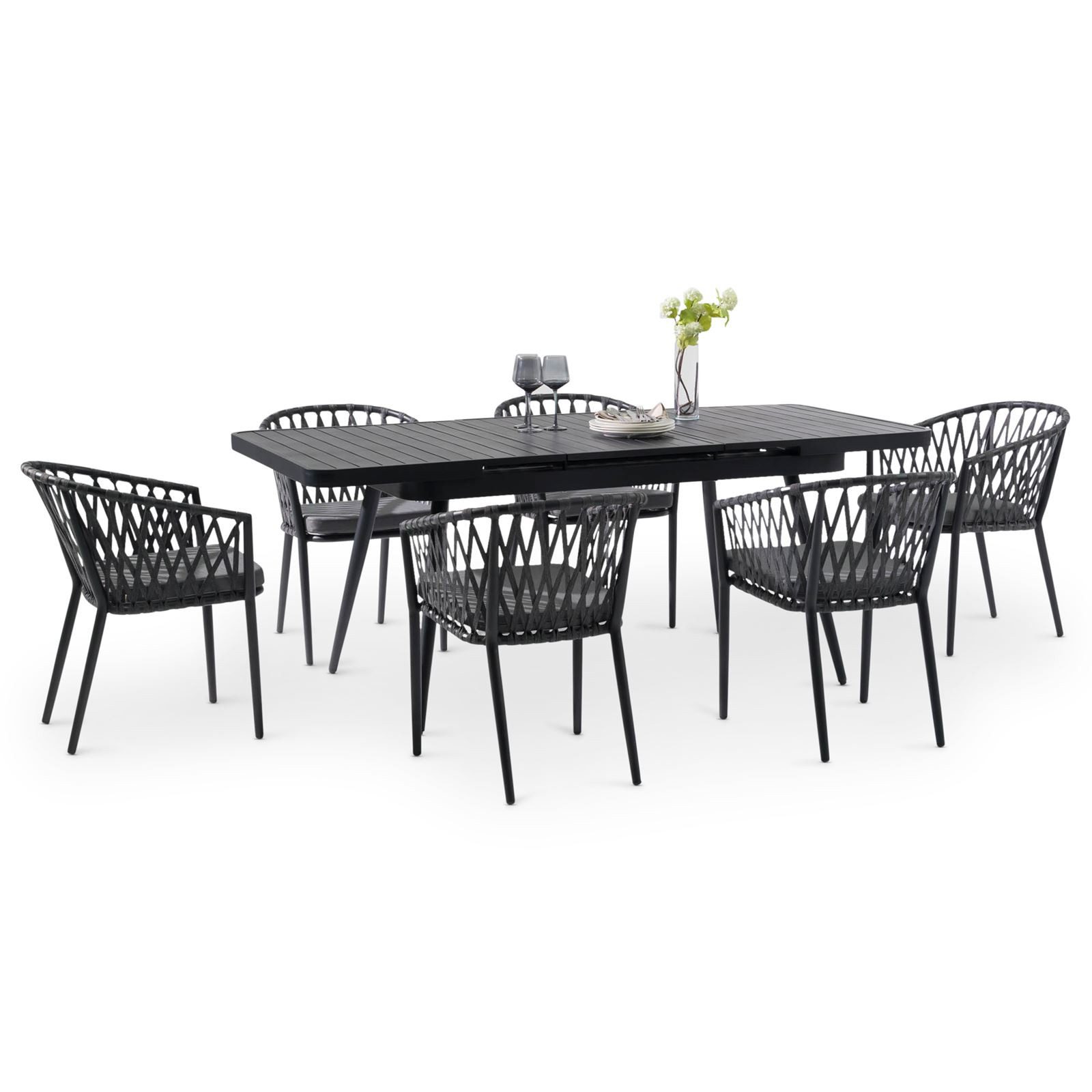 Das Terrassenmöbel Set Sunny in Schwarz und Grau verbindet moderne Eleganz mit Funktionalität. Der ausziehbare Tisch aus pulverbeschichtetem Aluminium lässt sich dank integrierter Verlängerungsplatte mühelos allein von 150 auf 200 cm erweitern. Sechs stapelbare Stühle mit schwarzem Gestell und geflochtener Rope-Bespannung in Anthrazit bieten gemeinsam mit den wasserabweisenden Polstern besten Sitzkomfort. Perfekt für Terrasse, Garten oder Balkon.