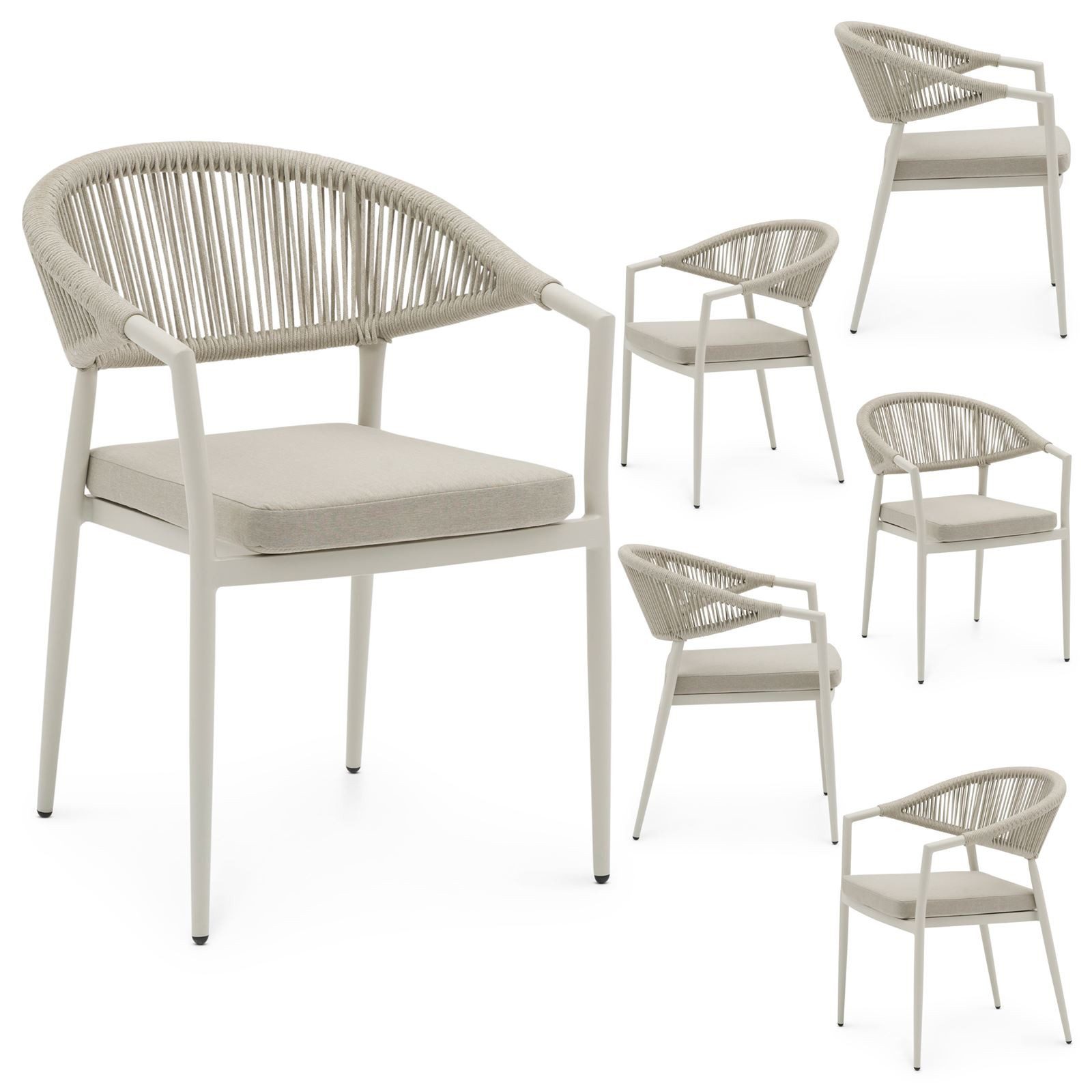 Der Outdoor Stuhl Seli überzeugt mit modernem Design, hoher Funktionalität und erstklassigem Sitzkomfort. Das pulverbeschichtete Aluminiumgestell ist robust und witterungsbeständig, während das beige Rope-Geflecht Rücken und Armlehnen elegant betont. Das gepolsterte Sitzkissen sorgt für Komfort bei jeder Outdoor-Mahlzeit. Die Stühle sind stapelbar und ideal für Garten, Terrasse oder Balkon geeignet.
