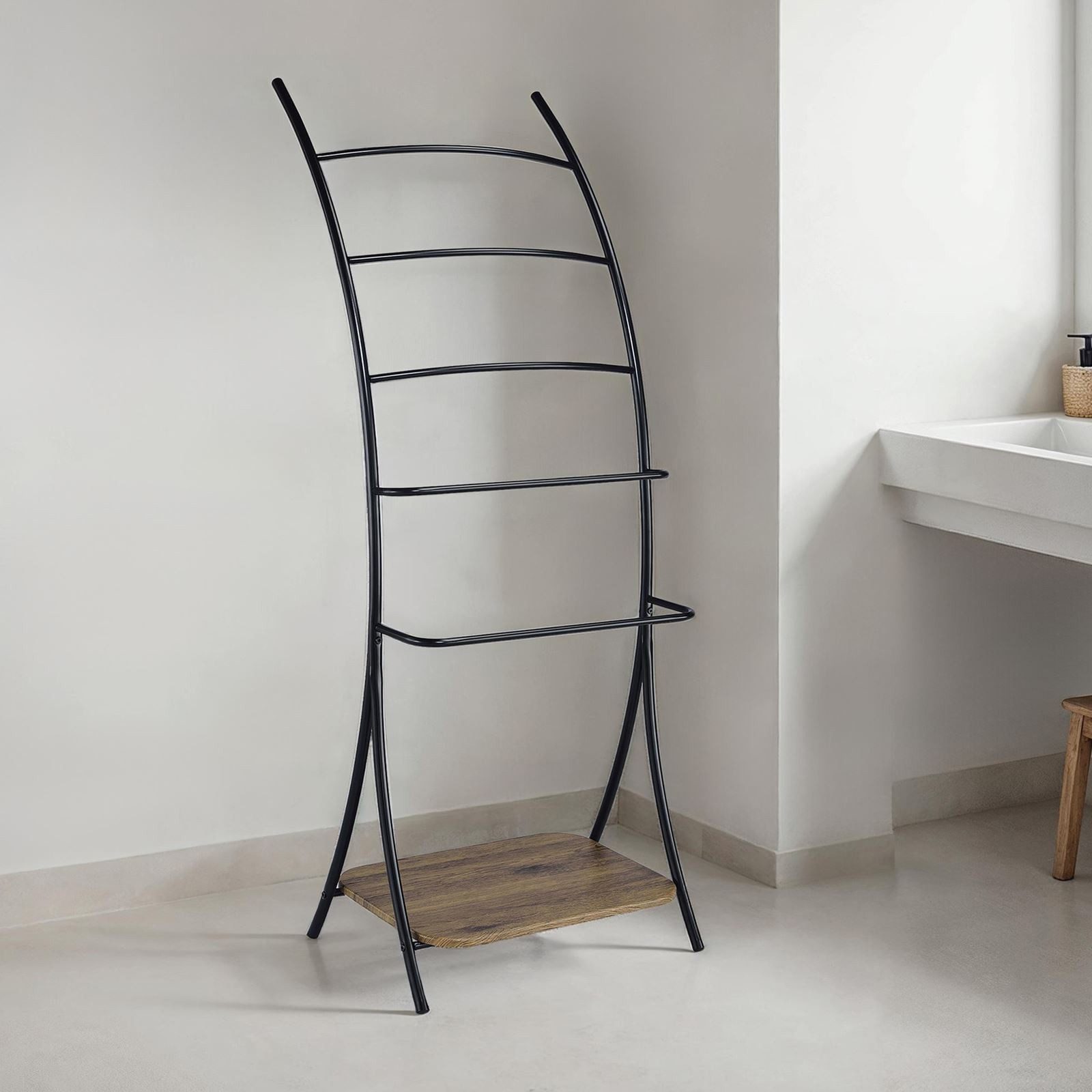 Der Handtuchhalter EDY überzeugt mit fünf versetzt angeordneten Stangen, auf denen Handtücher optimal trocknen können – ohne aneinanderzukleben. Eine zusätzliche Ablage bietet Platz für Ihre Badutensilien. Der Handtuchtrockner steht stabil und benötigt keine Wandmontage, sodass es flexibel im Raum platziert werden kann.