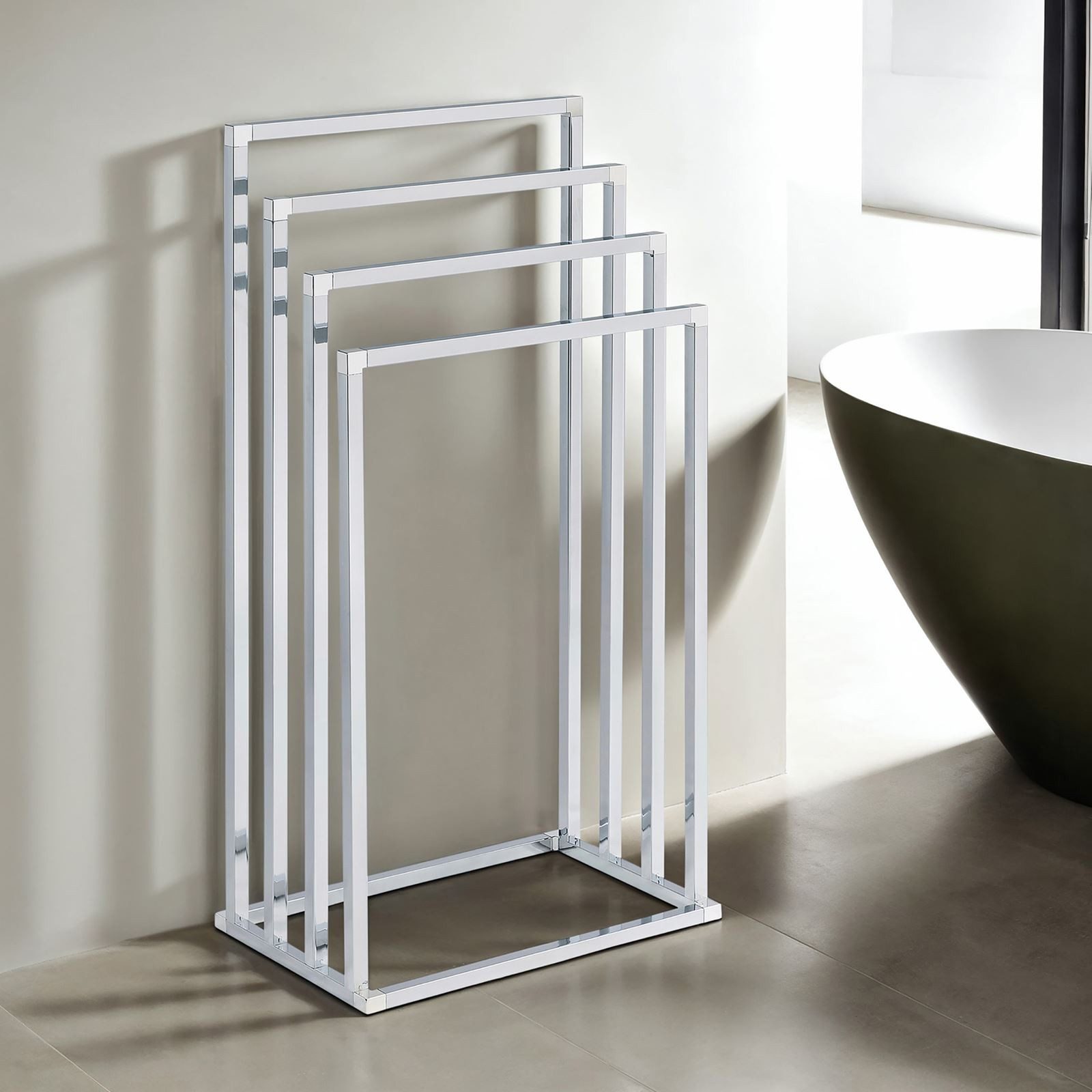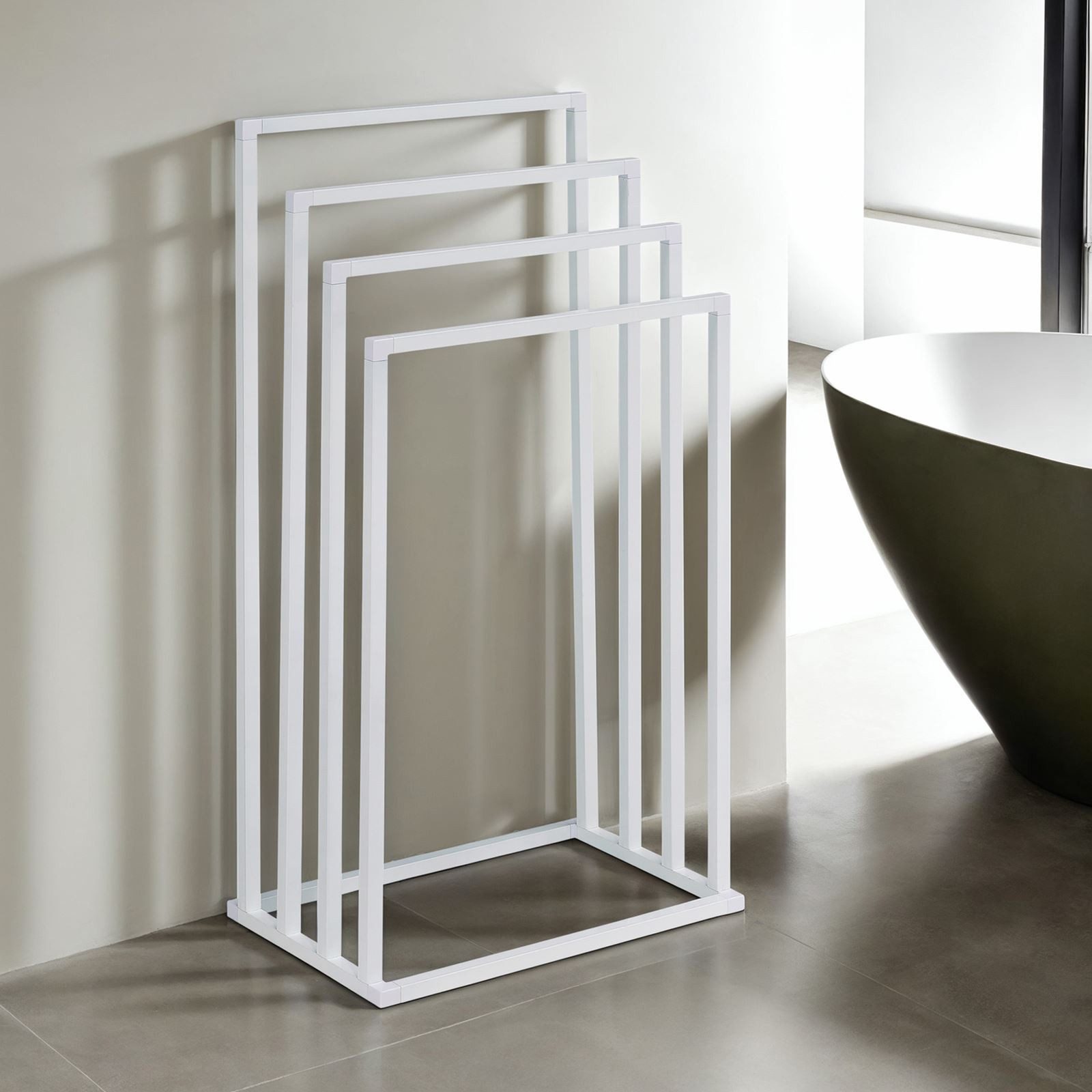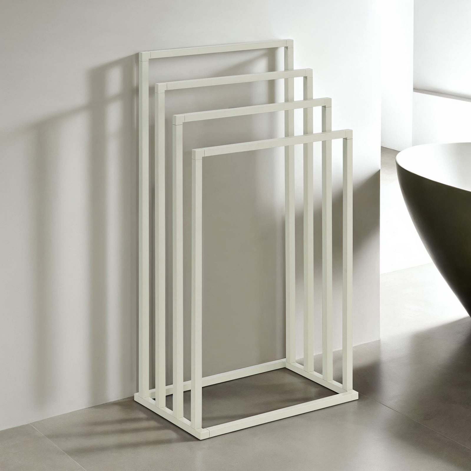 Der Handtuchhalter SENZA bietet mit vier versetzt angeordneten Stangen viel Platz für die griffbereite Aufbewahrung sowie das optimale Trocknen von Handtüchern. Die Konstruktion aus pulverbeschichtetem Metall sorgt für Stabilität und Langlebigkeit, während Betonelemente im Inneren zusätzlich für hohe Standfestigkeit sorgen. So organisieren Sie Ihr Badezimmer modern und funktional.