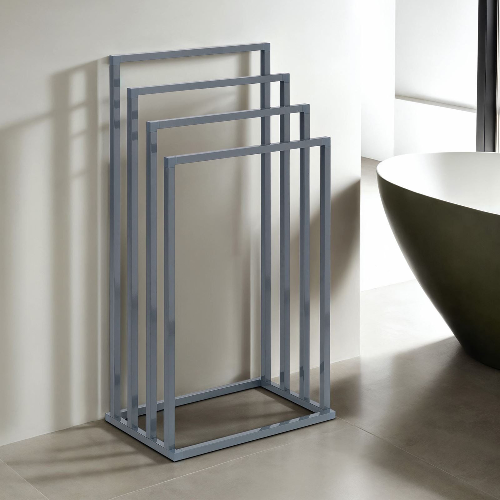 Der Handtuchhalter SENZA bietet mit vier versetzt angeordneten Stangen viel Platz für die griffbereite Aufbewahrung sowie das optimale Trocknen von Handtüchern. Die Konstruktion aus pulverbeschichtetem Metall sorgt für Stabilität und Langlebigkeit, während Betonelemente im Inneren zusätzlich für hohe Standfestigkeit sorgen. So organisieren Sie Ihr Badezimmer modern und funktional.