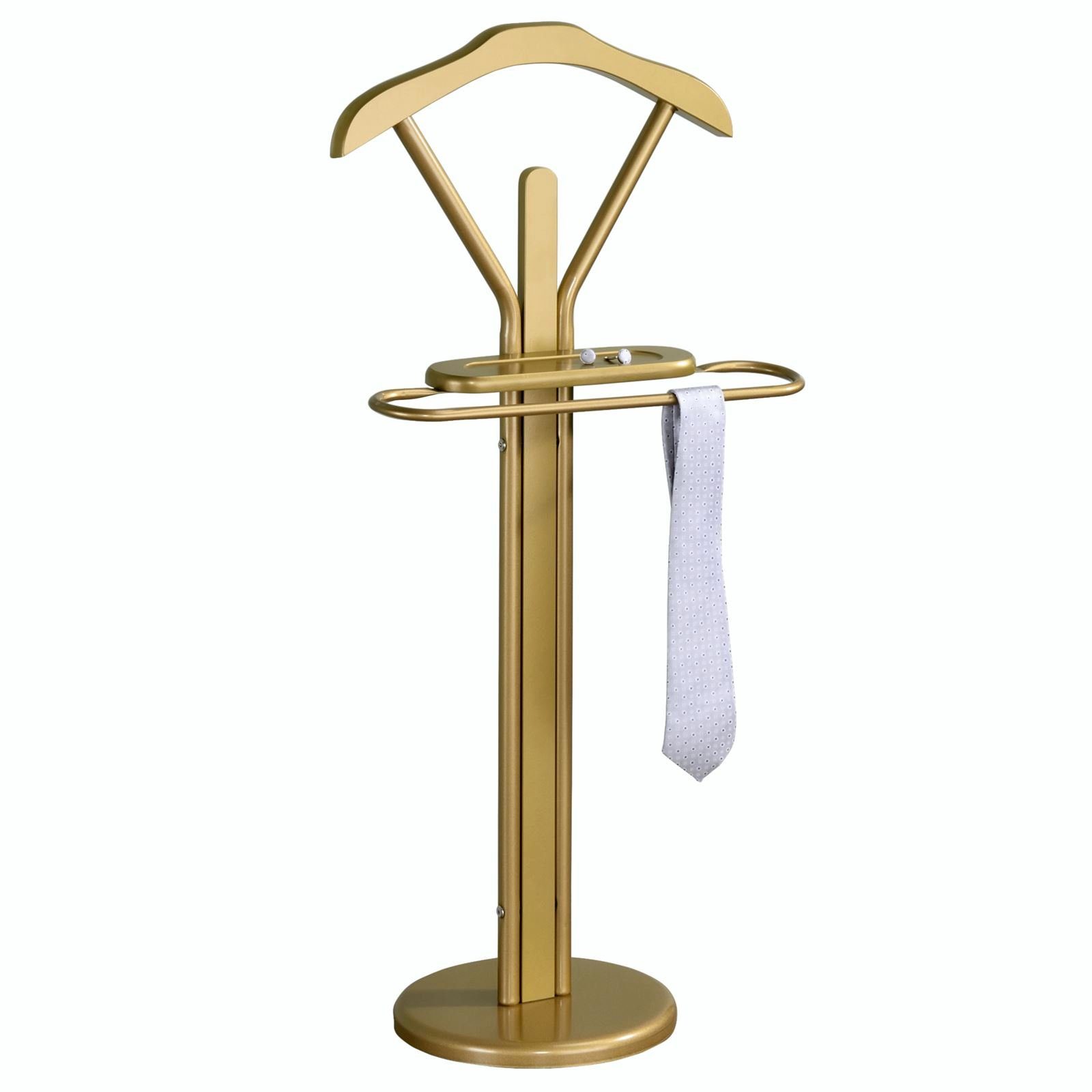 hilft Ordnung im Schlafzimmer zu halten. Die modische und stabile Kombination aus goldig lackierter MDF-Platte und goldig lackiertem Metall passt in die meisten Einrichtungsstile und verleiht ihnen ein zauberhaftes Ambiente. Der Herrendiener ist mit einem Kleiderbügel und mit einem Hosenbügel ausgestattet, dadurch ist das knitterfreie Ablegen von Hemden, Jacken und anderen Kleidungsstücken möglich. Mobiltelefon, Schmuck oder Portemonnaie liegen auf der praktischen Ablage des Kleiderbutlers immer griffbereit.