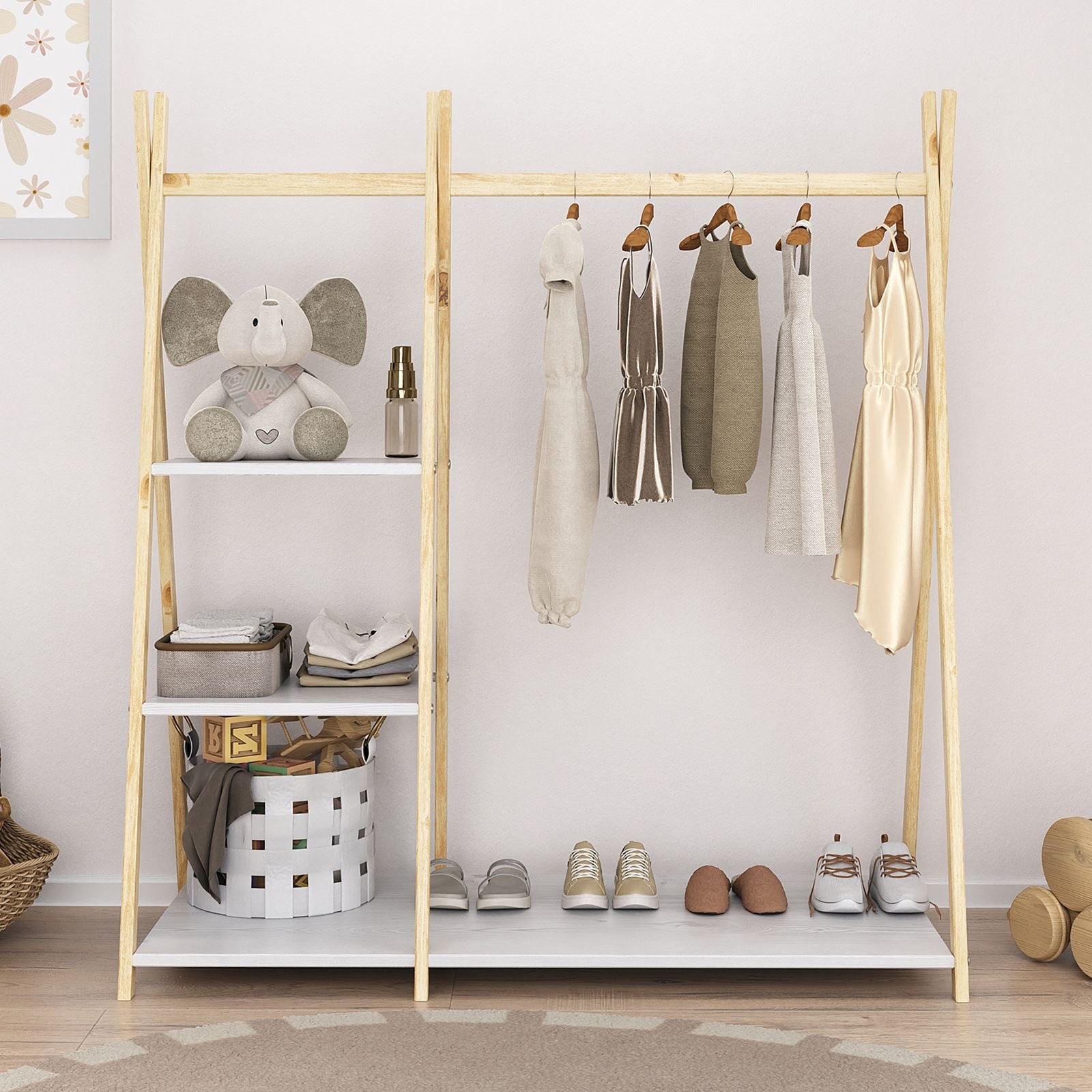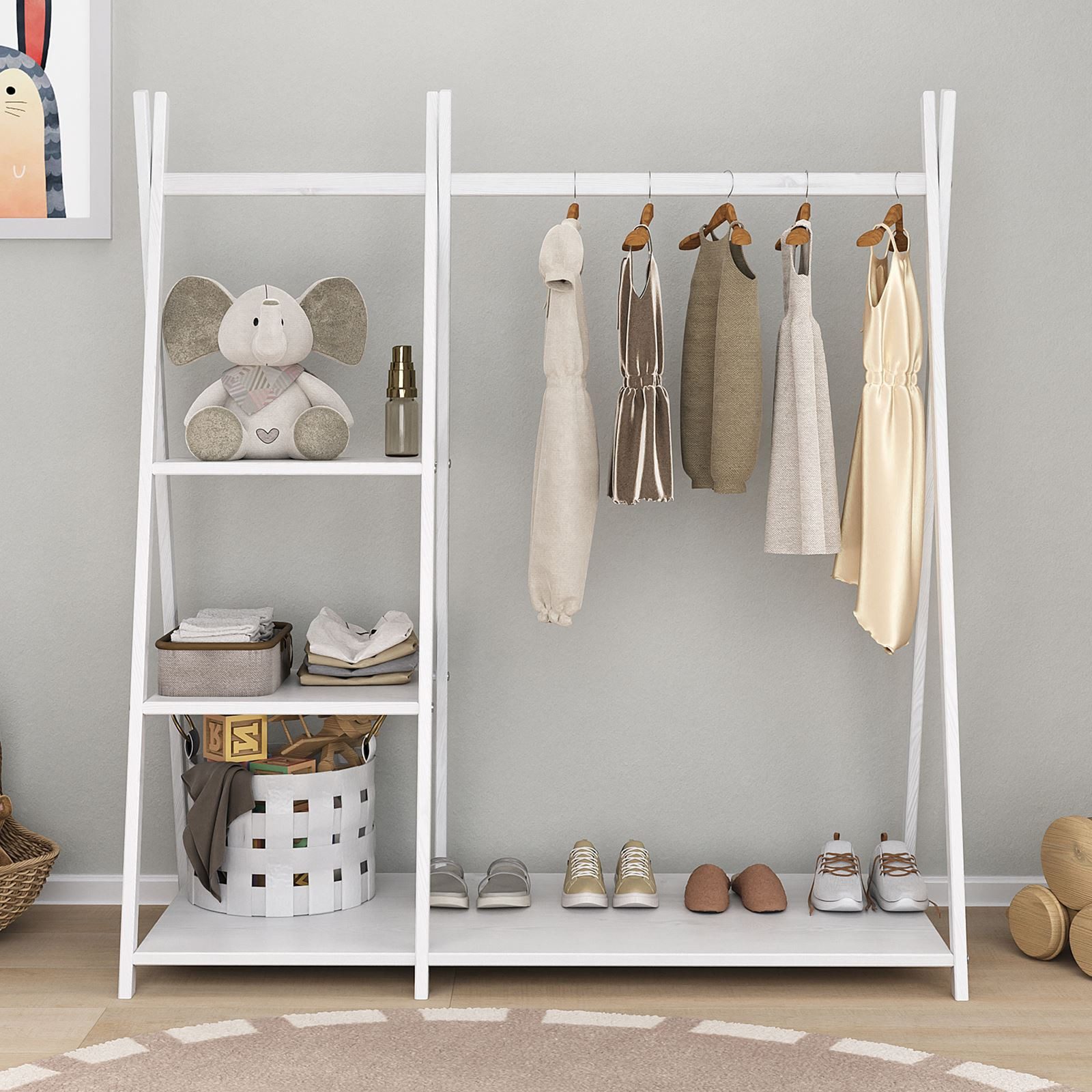 Der Kinder Kleiderständer LOTTE ist die perfekte Ergänzung für jedes Kinderzimmer. Mit einer praktischen Kleiderstange und 4 großzügigen Ablageböden bietet sie reichlich Platz für Kleidung, Schuhe, Taschen oder Spielzeug. Das schlichte Tipidesign fügt sich harmonisch in verschiedene Einrichtungsstile ein und schafft eine aufgeräumte Atmosphäre. Gefertigt aus hochwertigem, massivem Kiefernholz in elegantem Weiß lackiert, kombiniert sie Langlebigkeit mit modernem Stil. Dank des freistehenden Designs ist es flexibel platzierbar und ideal für kleine Entdecker, die ihre Sachen selbstständig organisieren möchten. Das von Montessori inspirierte Konzept fördert die Selbstständigkeit und ermöglicht es Kindern, ihre Kleidung und Accessoires leicht zu erreichen.