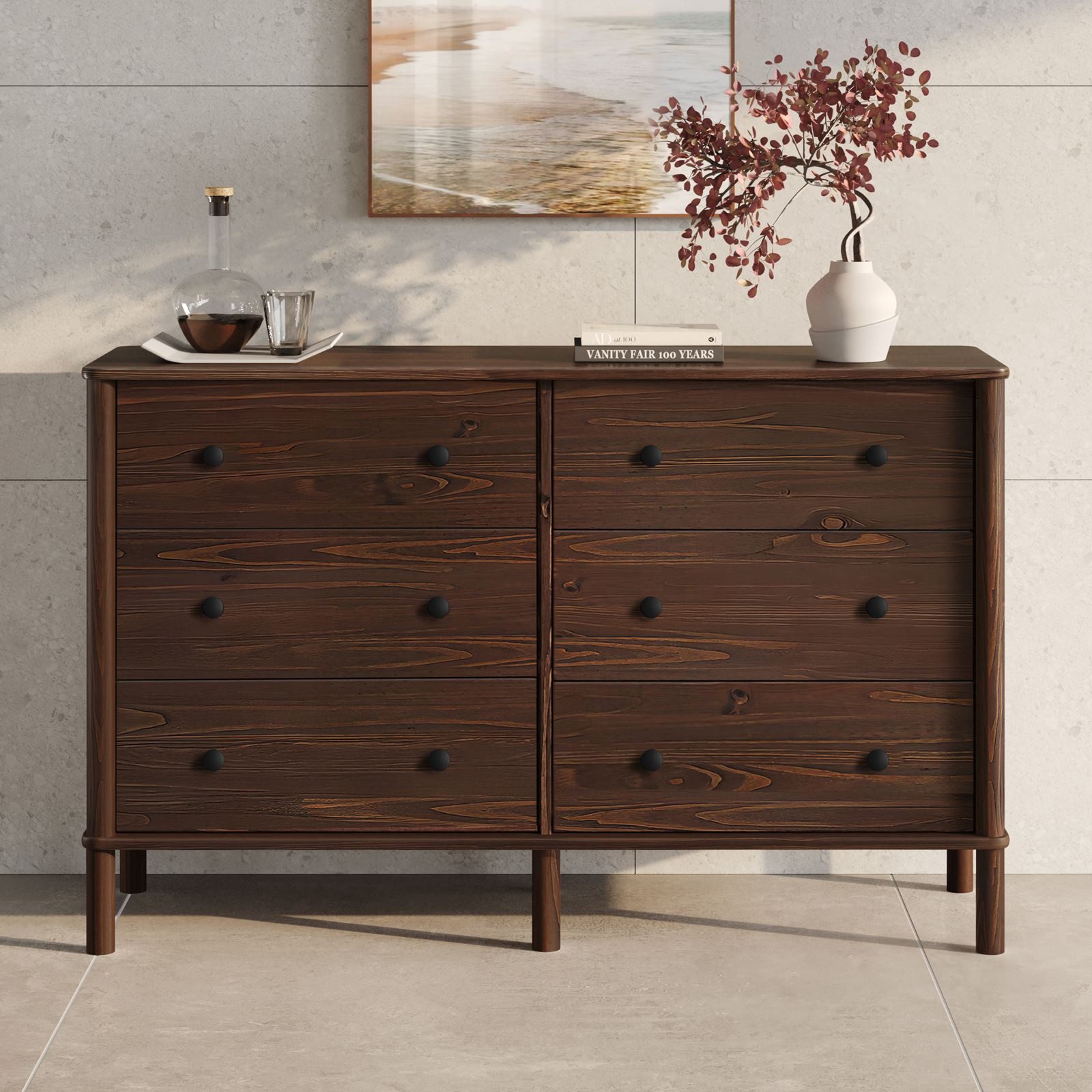 Die Schubladenkommode Apoana begeistert mit ihrem natürlichen Look in Nussbaum. Gefertigt aus Massivholz bietet sie mit 6 Schubladen jede Menge Stauraum für Kleidung, Accessoires und mehr. Dank der schwarzen Knopfgriffe und dem skandinavischen Design lässt sich der Schubladenschrank vielseitig in Flur, Schlafzimmer oder Wohnzimmer einsetzen. Durch die stabilen Metallauszüge öffnen und schließen die Schubladen angenehm leicht.