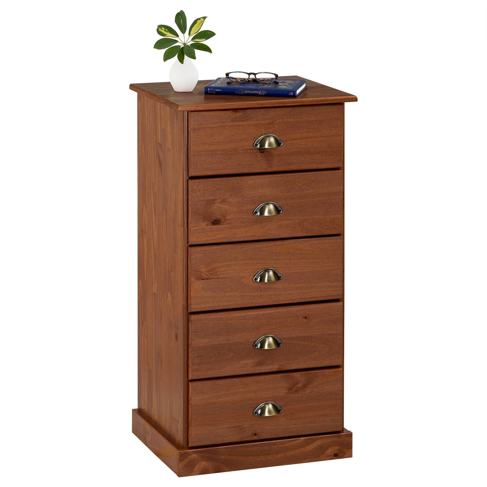 ist durch das schmale Design perfekt für jeden Wohnraum, egal ob für kleine oder große Zimmer. So kann jeder freie Platz optimal genutzt werden und in den 5 geräumigen Schubladen mit Muschelgriffen können viele Dinge staubfrei untergebracht werden. Die robuste Holzkommode kann mit bereits vorhandenen Möbelstücken gut kombiniert werden und ist somit ein ideales Beistellmöbel für Ihren Wohnbereich oder Esszimmer.