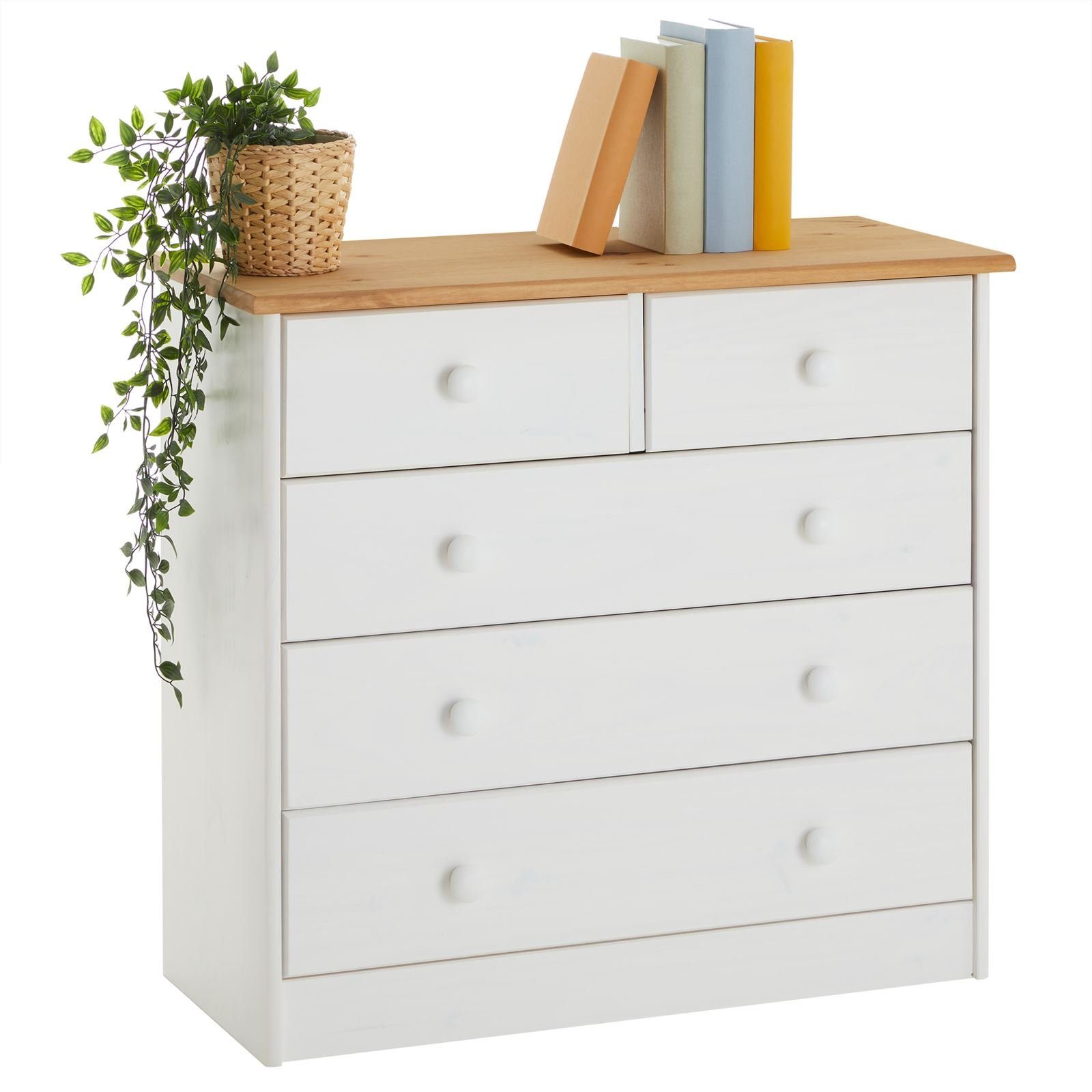 passt perfekt ins Schlafzimmer, in den Flur oder Wohnbereich. Das Kiefernholz stammt aus nachhaltiger Forstwirtschaft und wurde mit schadstoffarmen Lacken behandelt. Die 5 Schubladen bieten genügend Stauraum um alles Mögliche staubgeschützt aufzubewahren. Eine zeitlose Schubladenkommode, welche für viele Räume in Ihrer Wohnung geeignet ist.